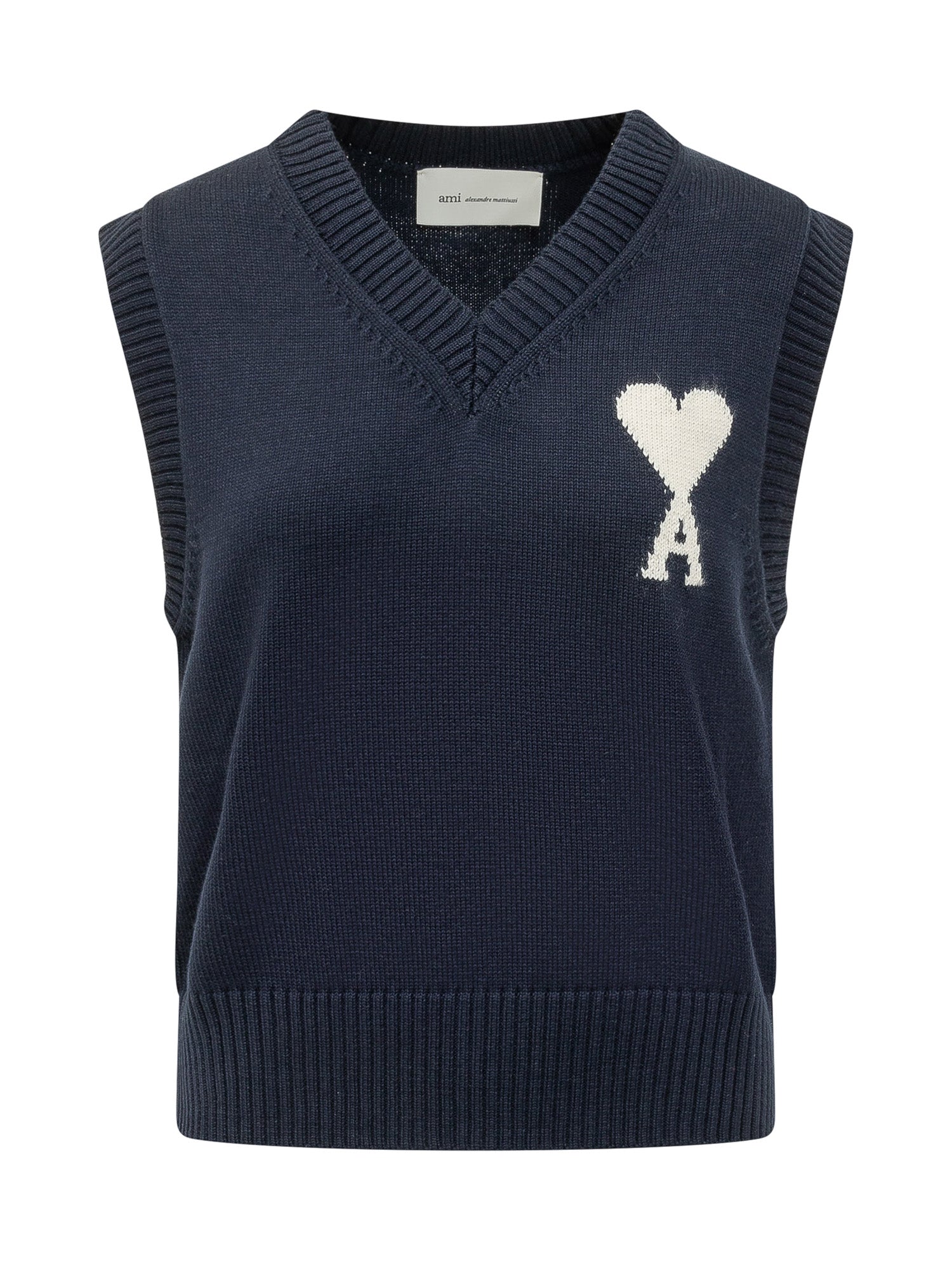 Sleeveless V-neck sweater with contrasting Ami de Coeur logo. Soft line.