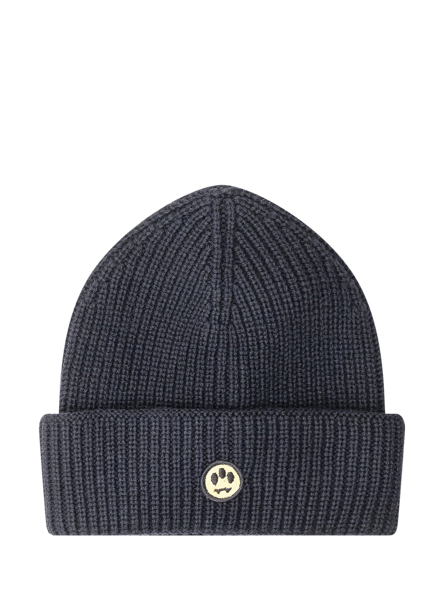 Barrow black ribbed knit beanie with fold-over brim and yellow smile logo patch.