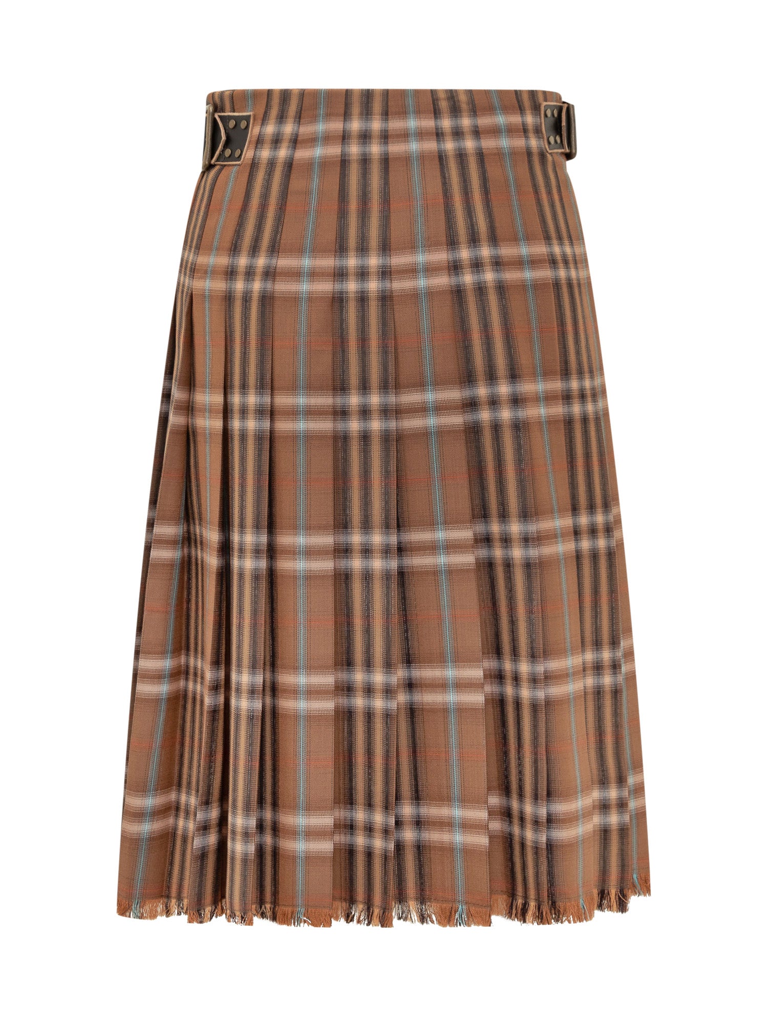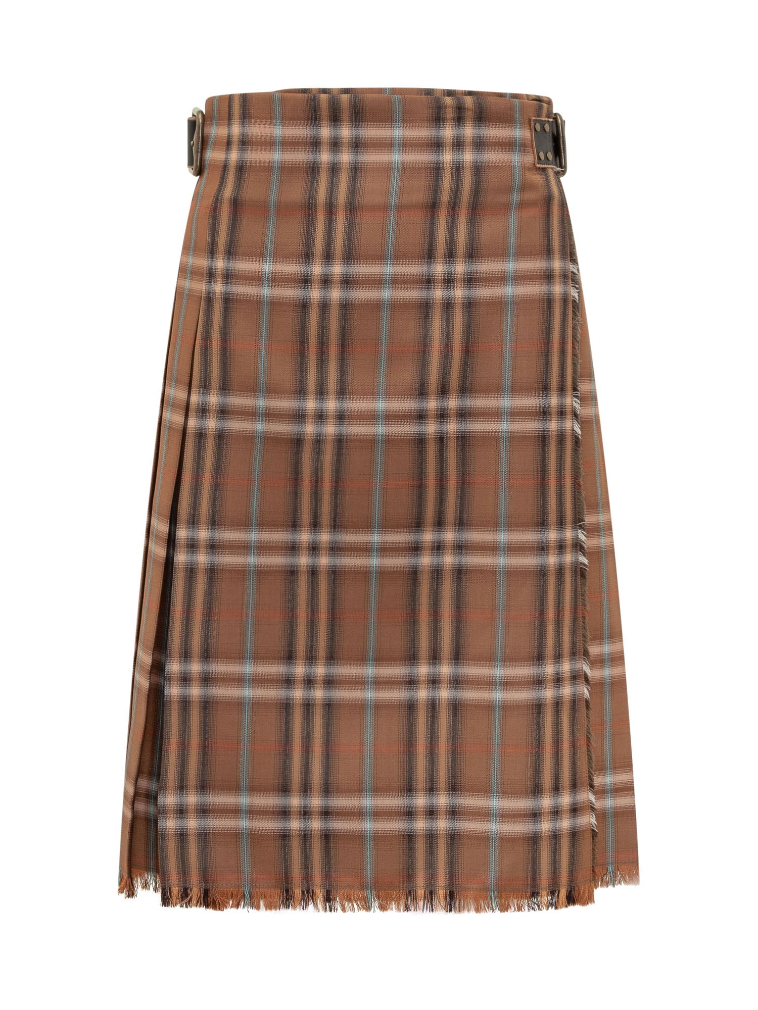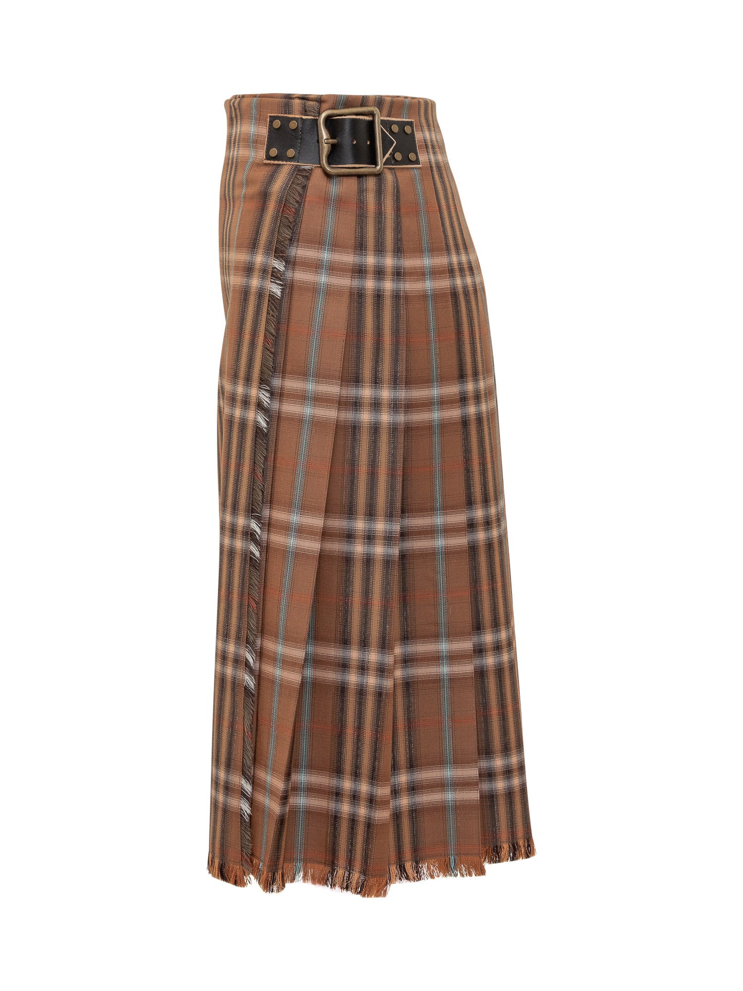 Checked midi skirt featuring double side buckle fastening and a frayed hem. Its structured design and classic appeal make it perfect for casual-chic.