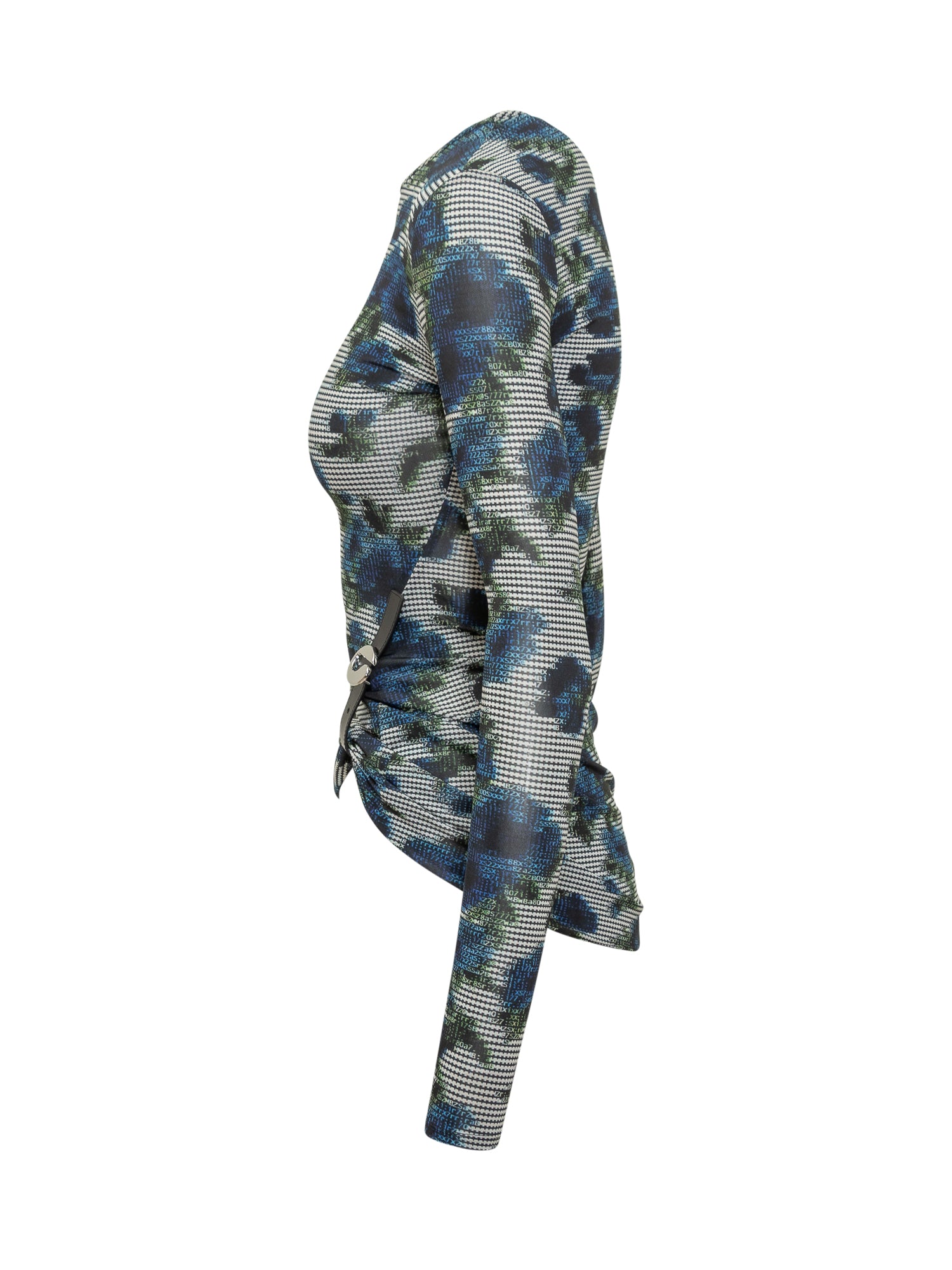 Coperni stretch top with floral print in blue and green tones. Features ruched detail with side buckle.
