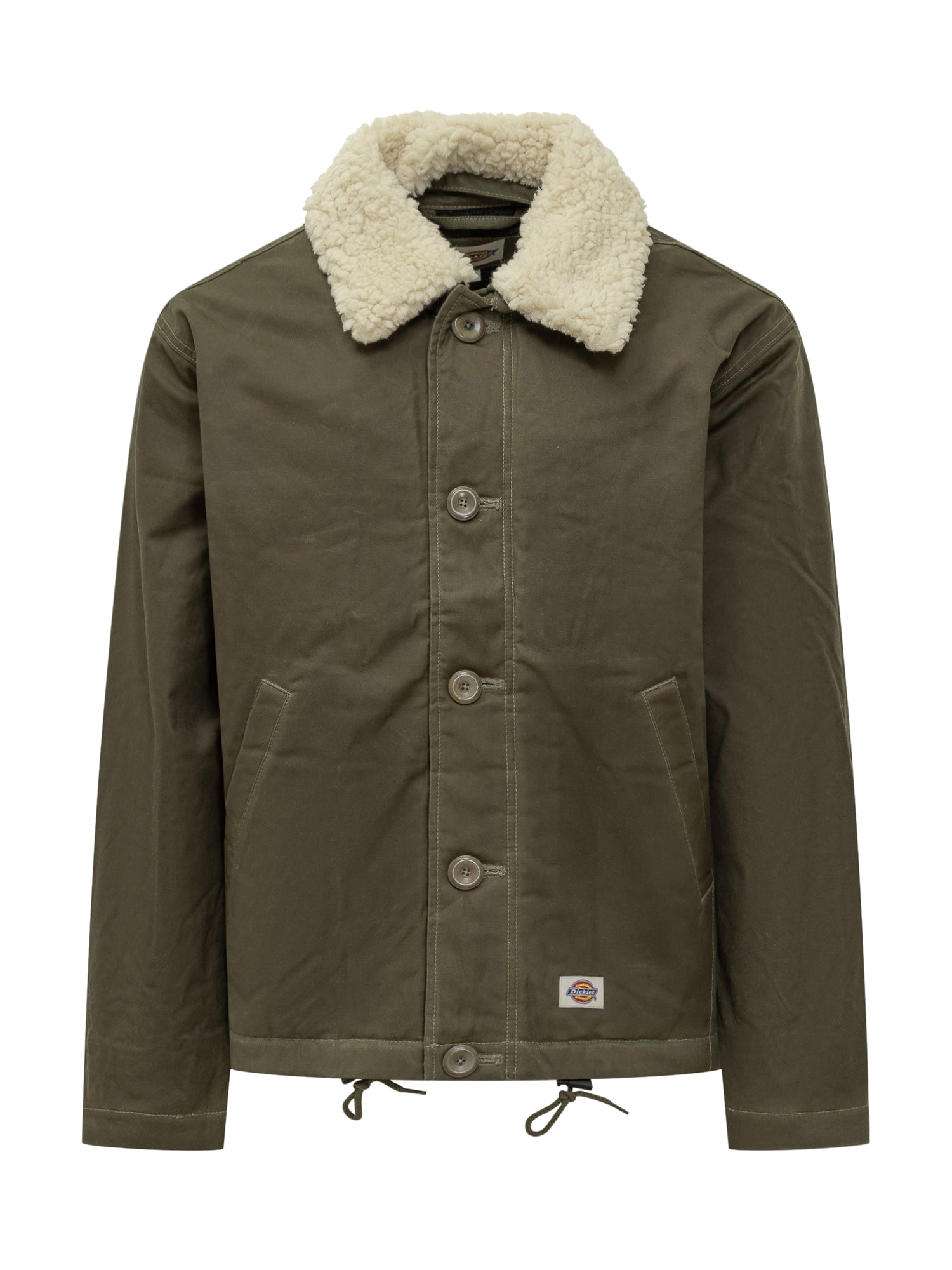 Dickies Threads olive green jacket with shearling collar, button closure and adjustable drawstring hem.