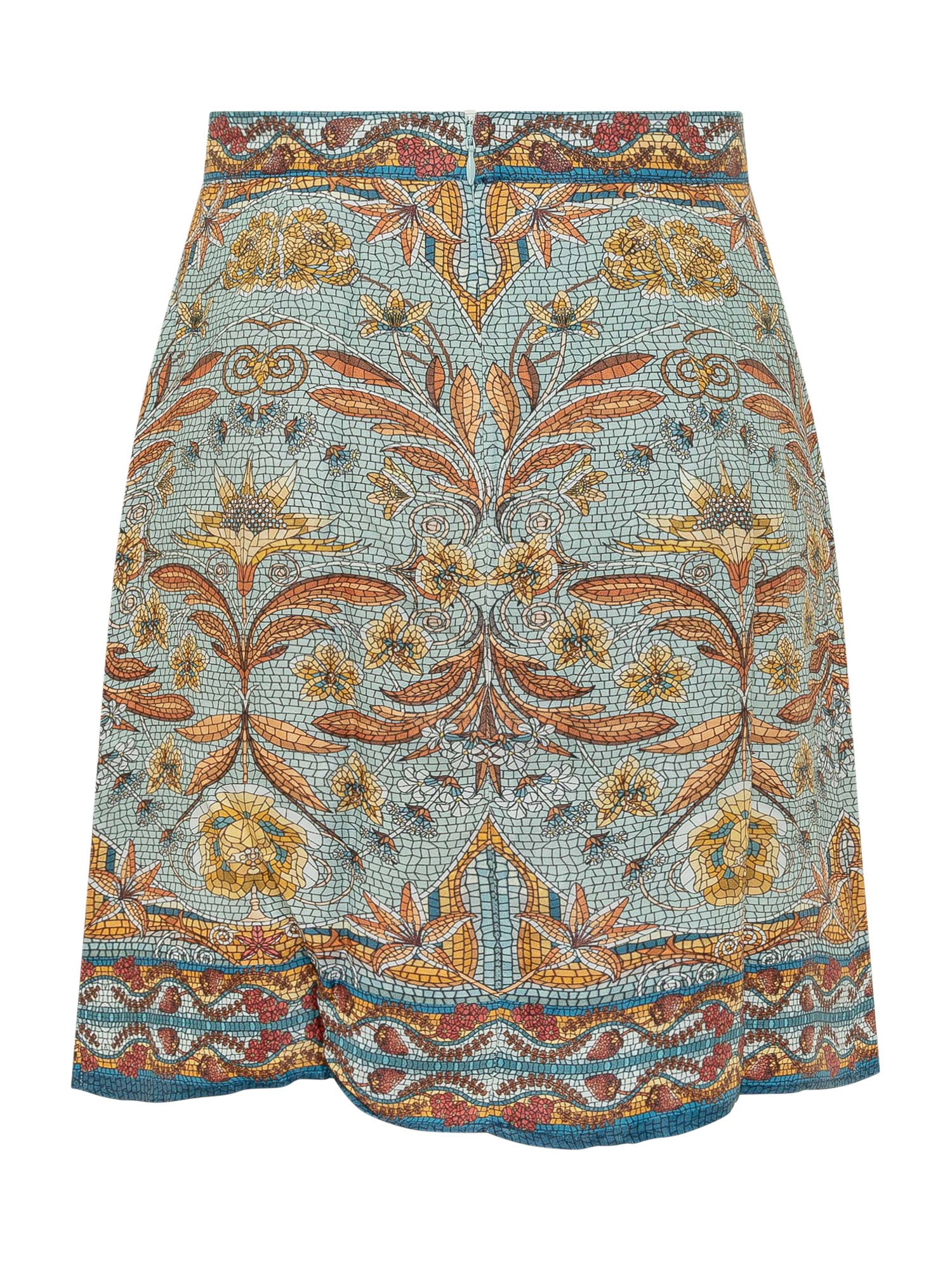 Cotton mini wrap skirt with mosaic-inspired print. Features a scalloped hem and feminine silhouette.