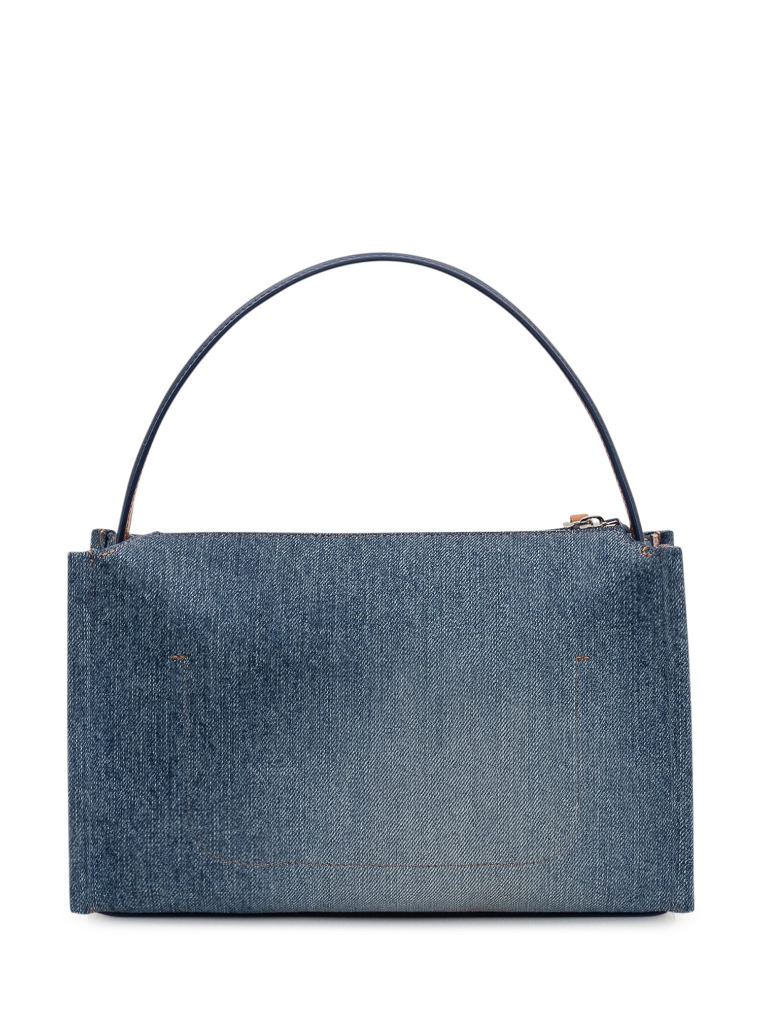 Top handle bag with rectangular structure and single handle. Front denim insert with contrasting central band and top zip closure. Modern and compact design, ideal for contemporary look