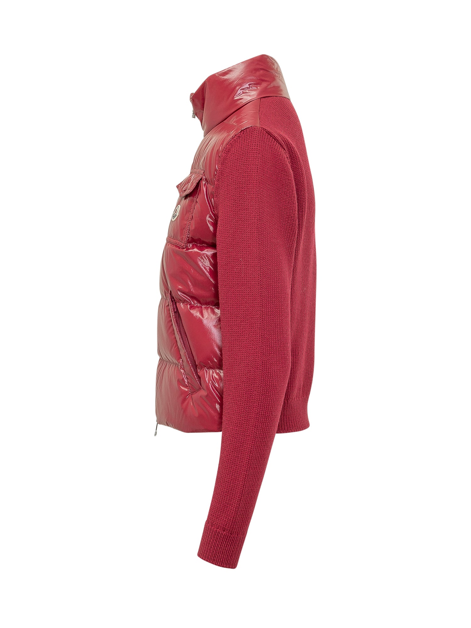Tricot cardigan combining functionality with iconic style, featuring a padded front panel in glossy nylon laqué and tricot knit sleeves.