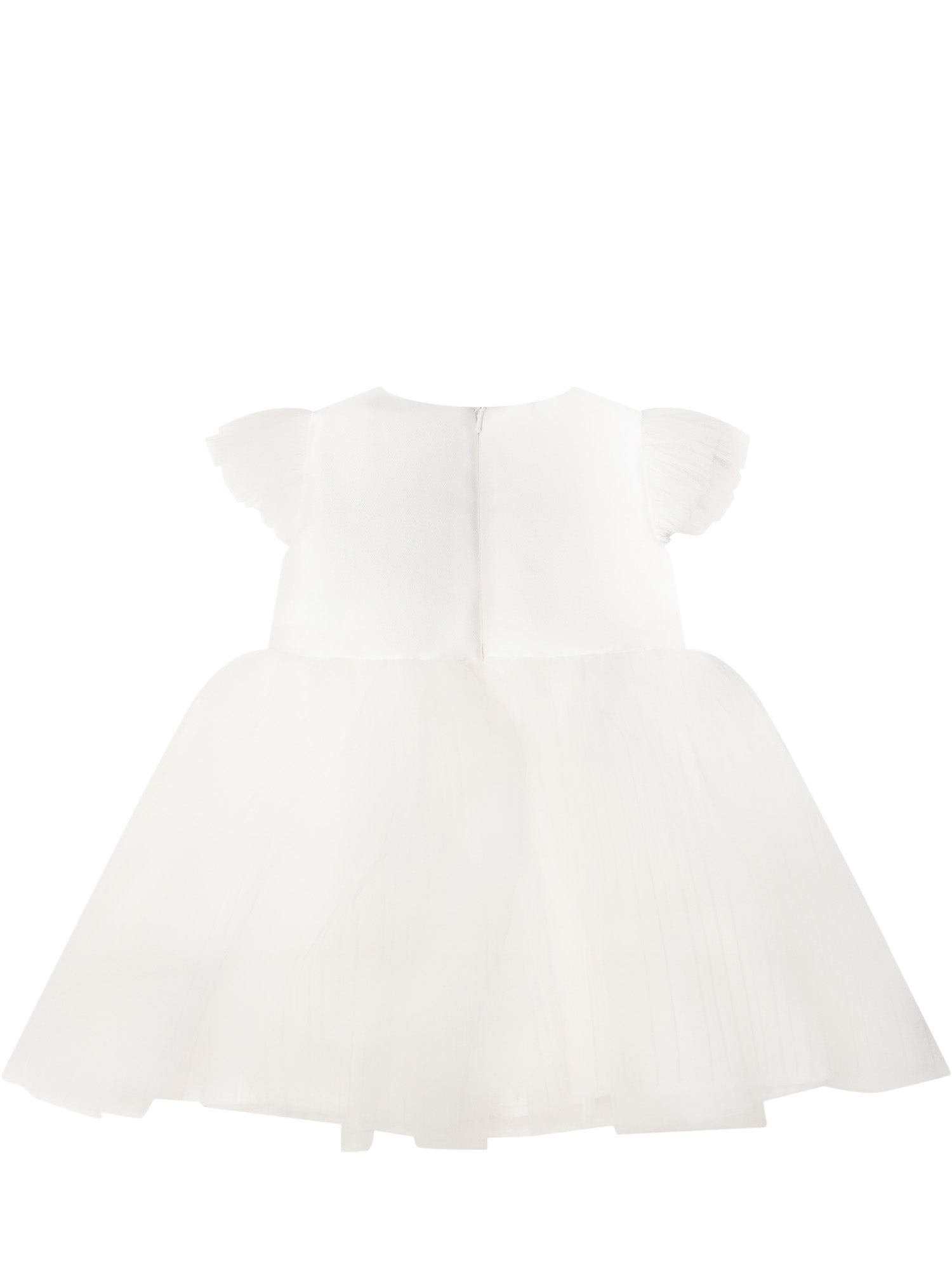 White pleated tulle sleeveless dress. Back zipper closure. Applied flowers at the waist.