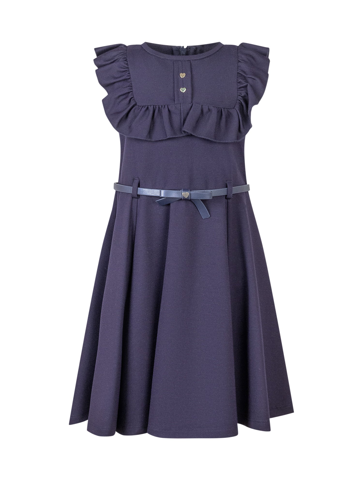 Monnalisa blue sleeveless dress with ruffled bodice, heart buttons and slim waist belt.