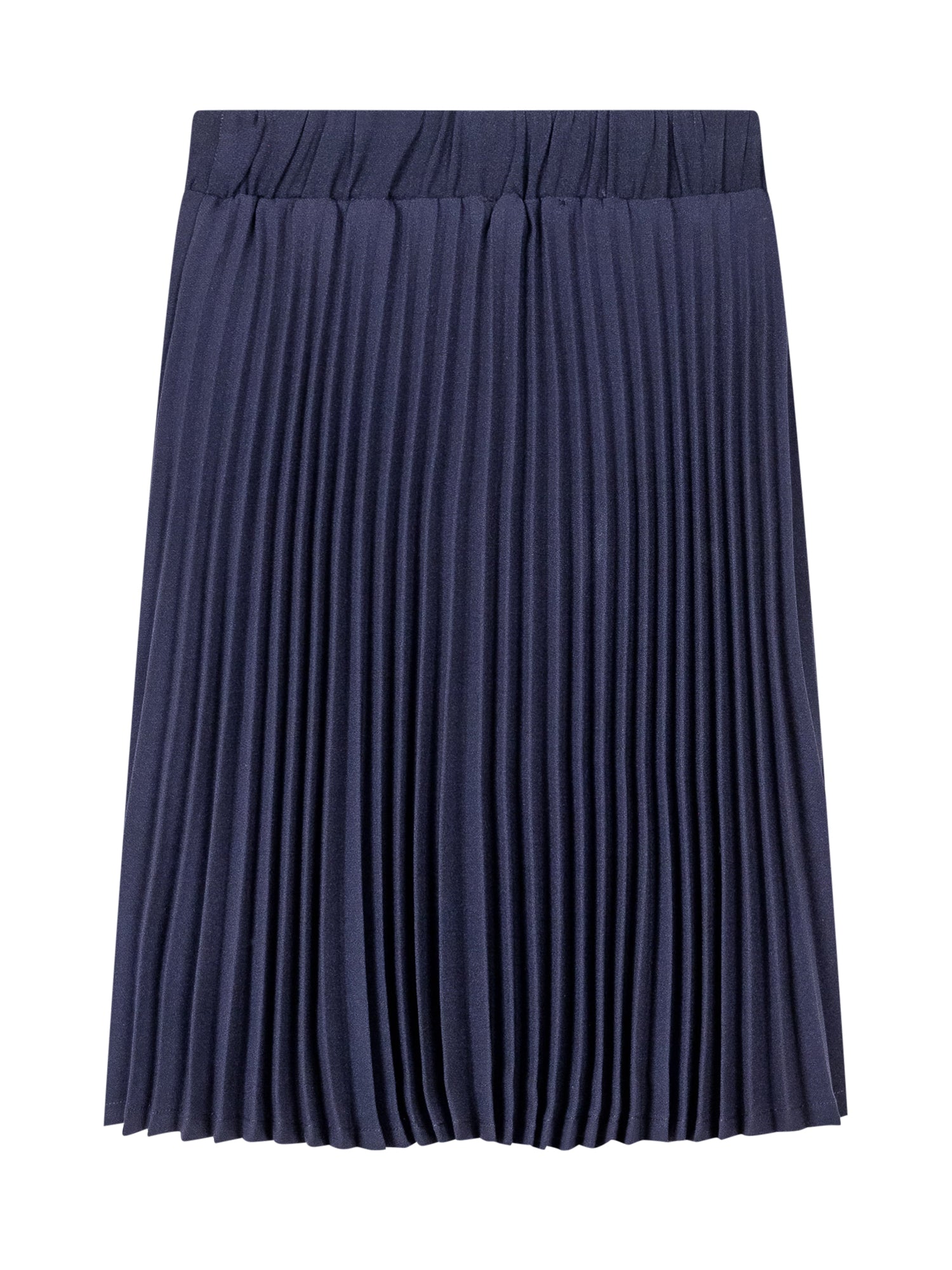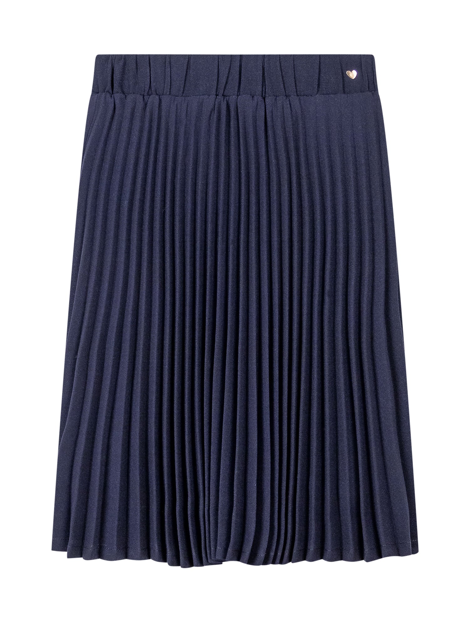Monnalisa blue pleated skirt with elastic waistband and heart logo detail.