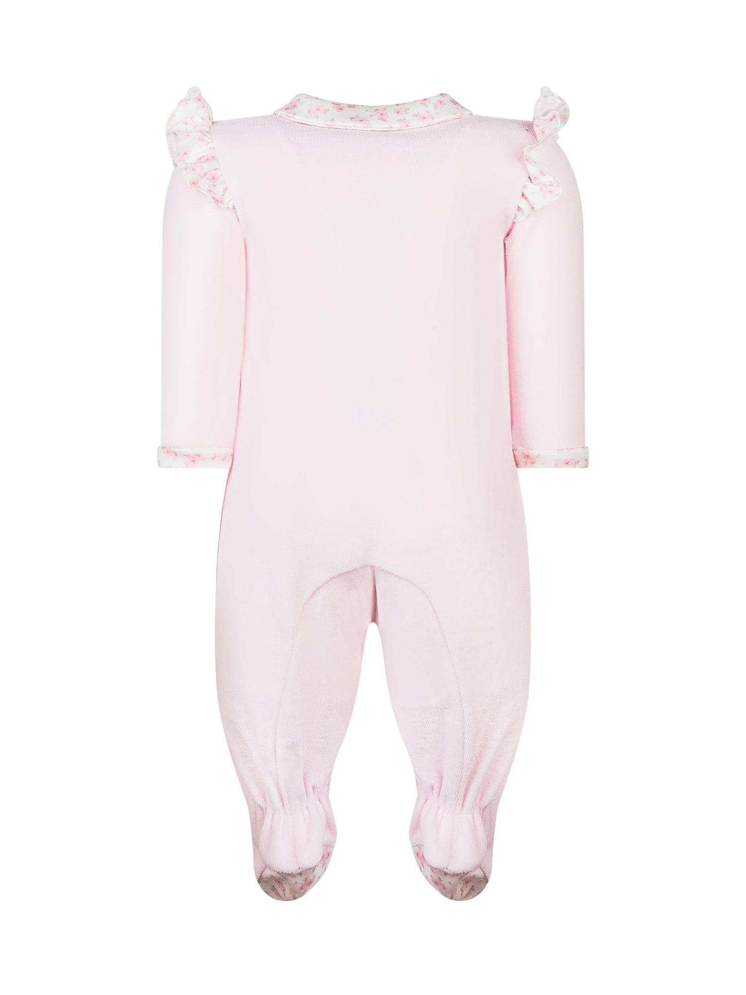 Monnalisa pink cotton romper featuring floral print collar and ruffled shoulders.