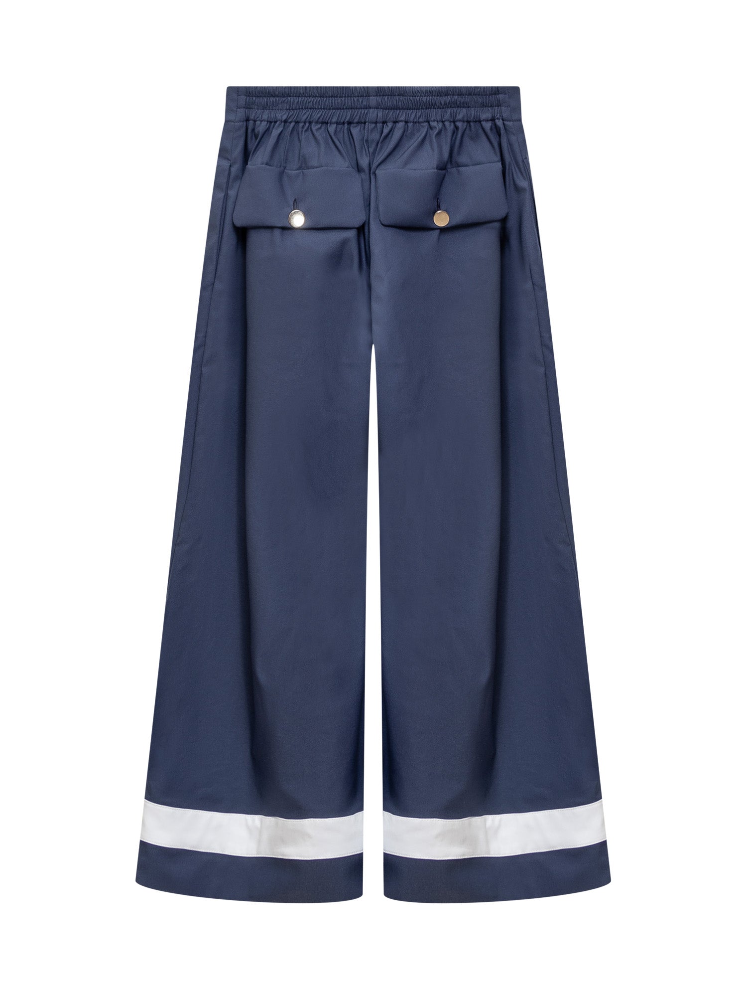 Blue stretch pants. Zipper and button front closure. Two pockets on the back. Stretch insert at back.