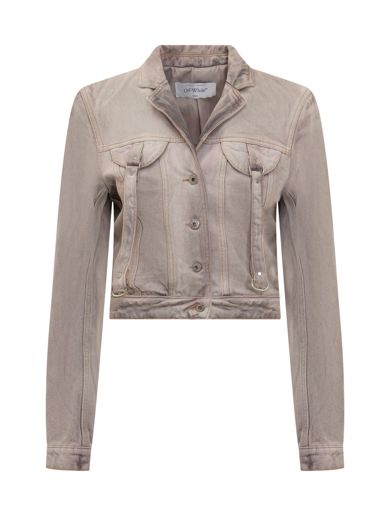 Short denim jacket. Long sleeves. Button closure. Applied straps on front.