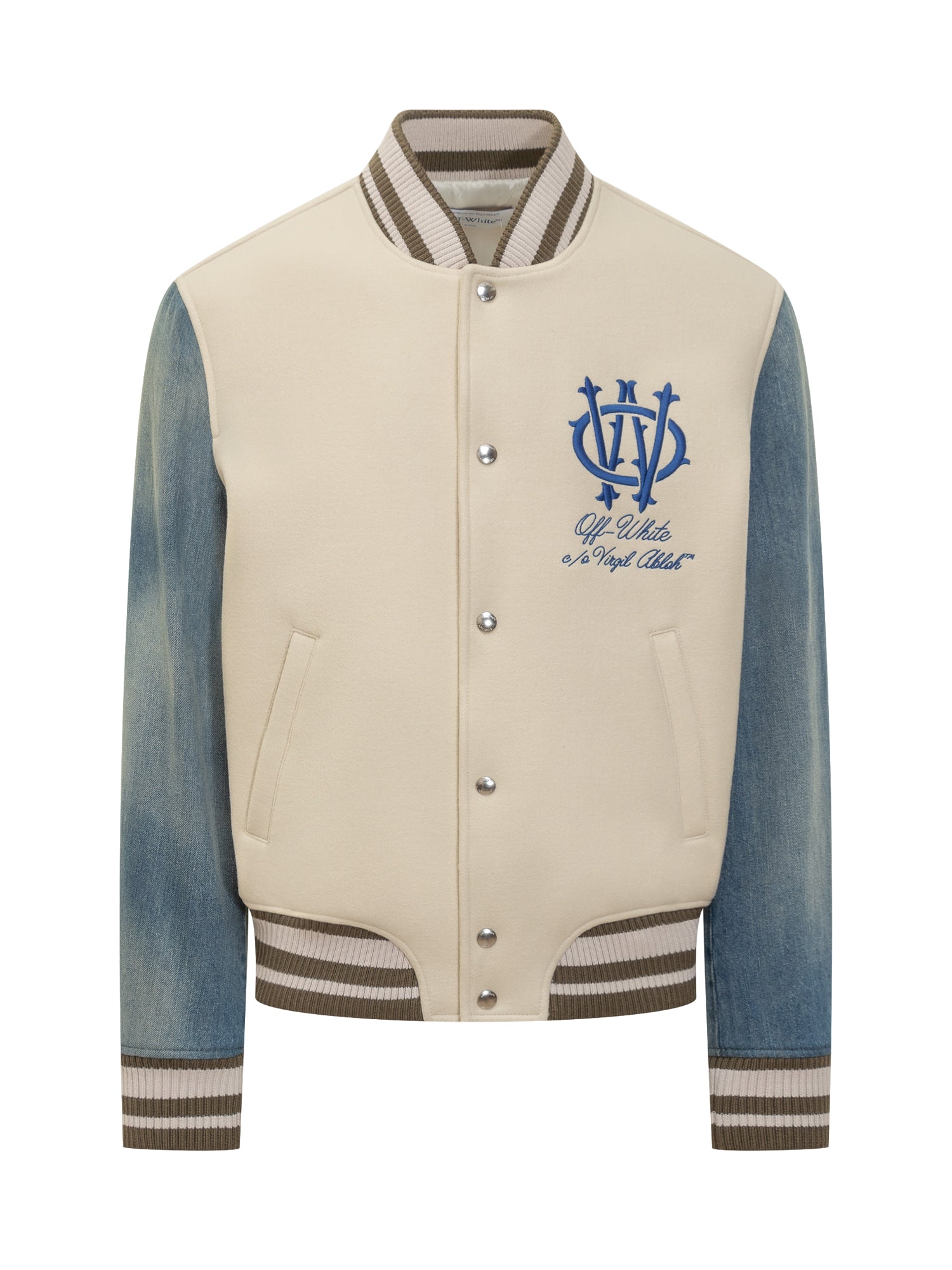 Off-White varsity jacket in wool with denim sleeves and ribbed details. Gothic logo embroidered on the chest and snap button closure.