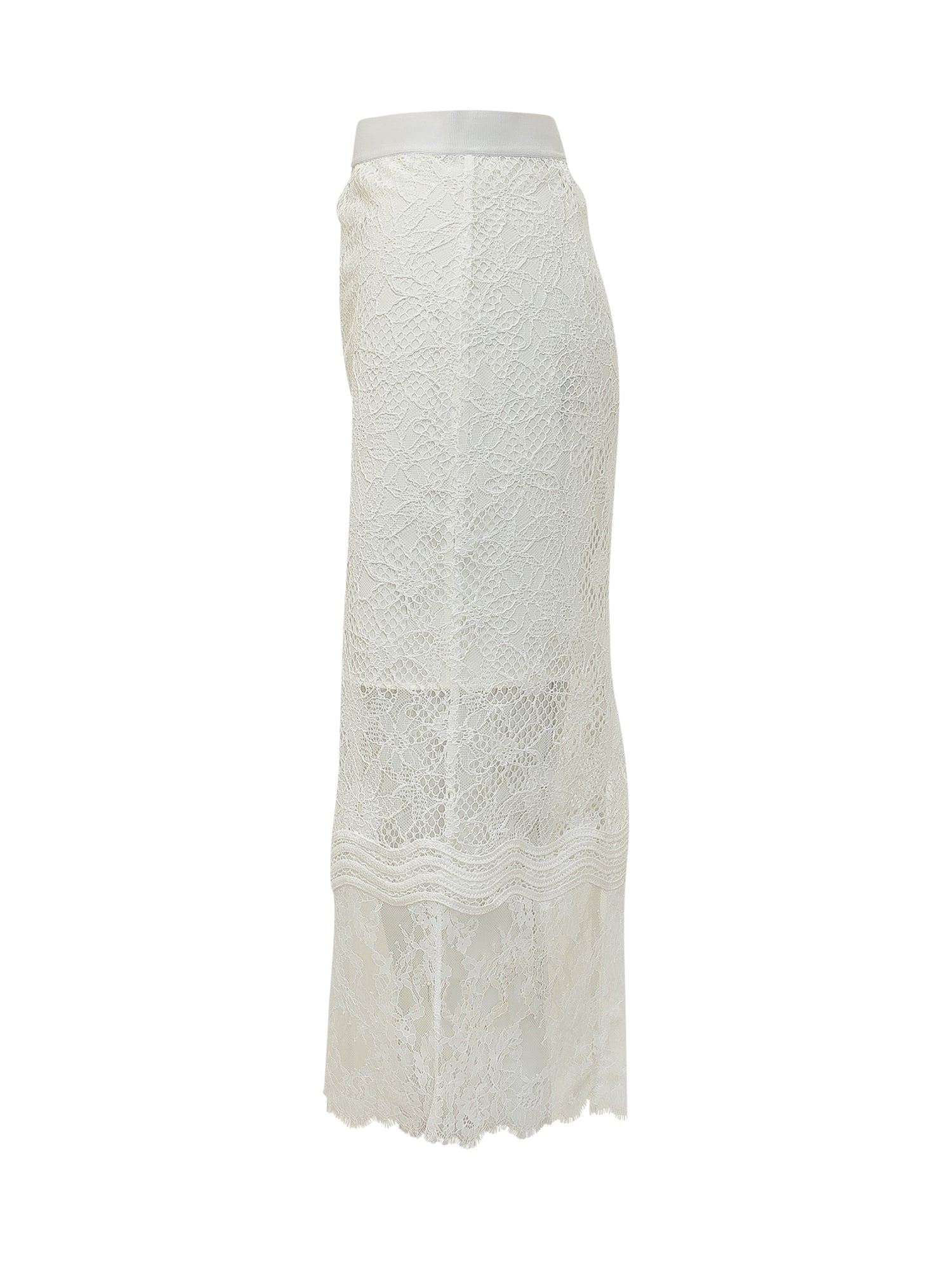 Womens midi lace skirt, elastic waistband, fitted and streamlined silhouette, scalloped hem with sheer details.
