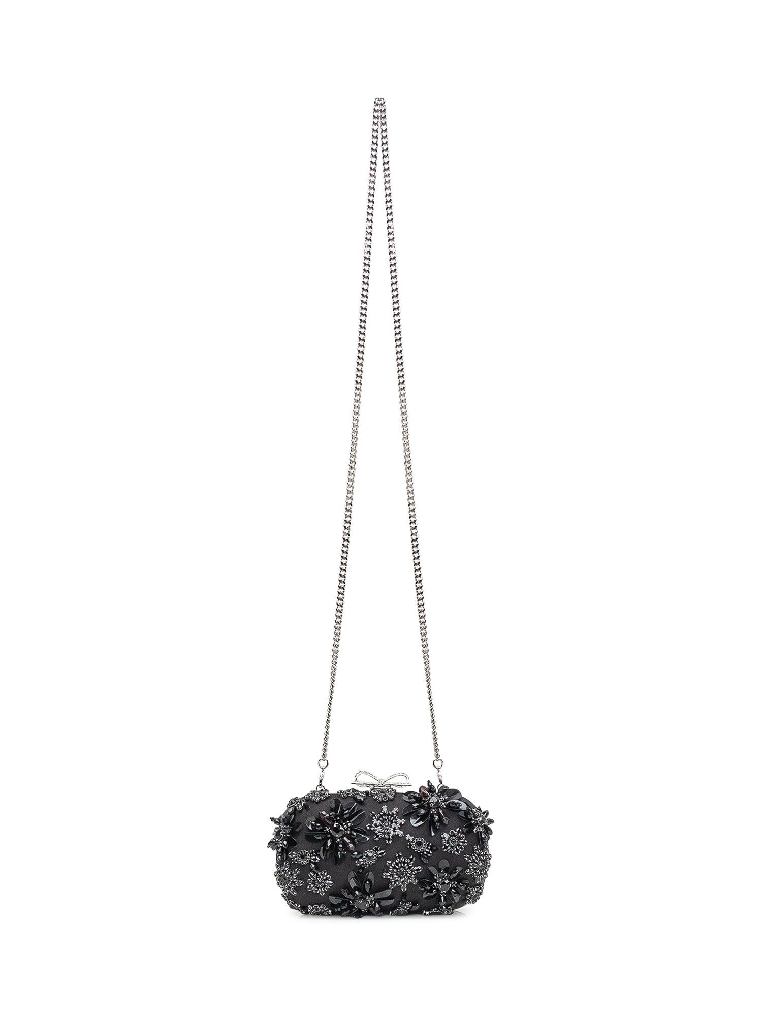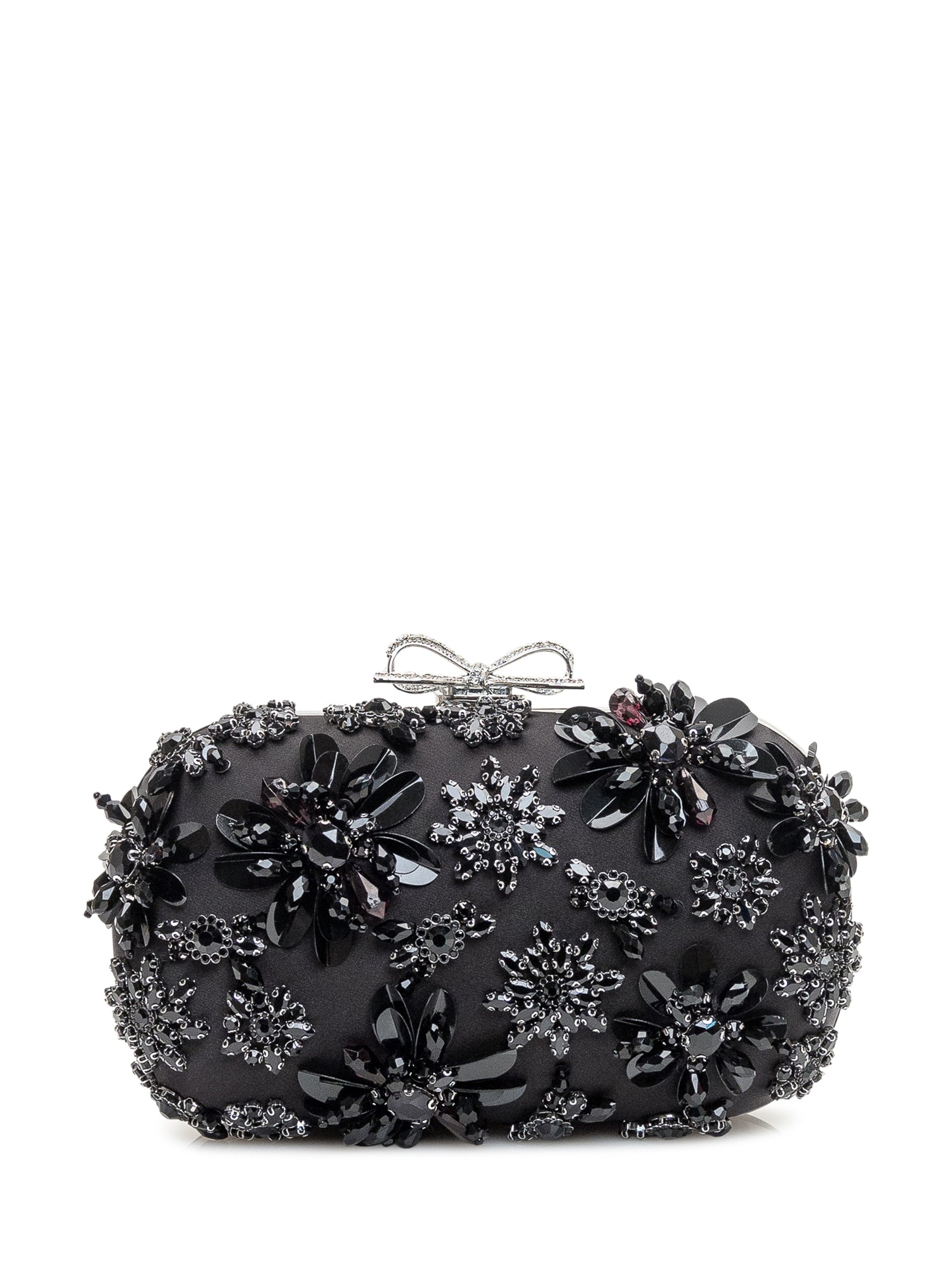 Structured clutch adorned with 3D floral appliqués and sparkling crystal details. Features a jeweled bow closure and compact silhouette.