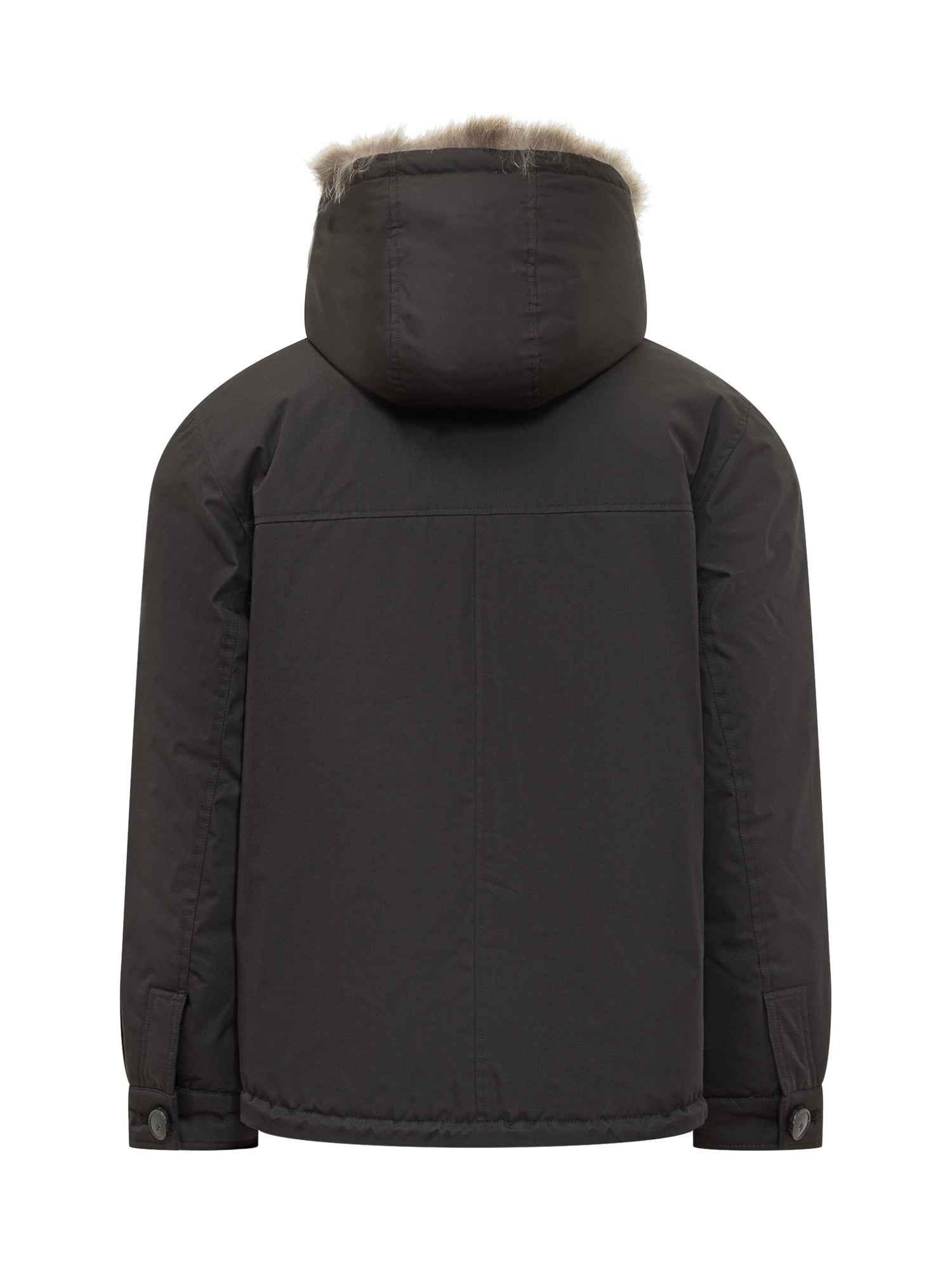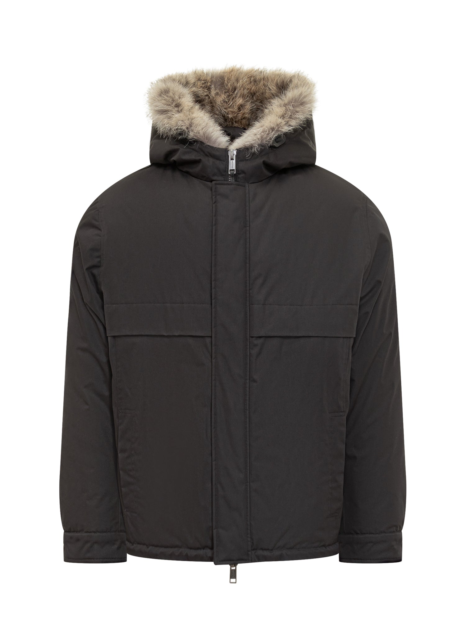 Yves Salomon black parka with fur-trimmed hood. Warm and versatile.
