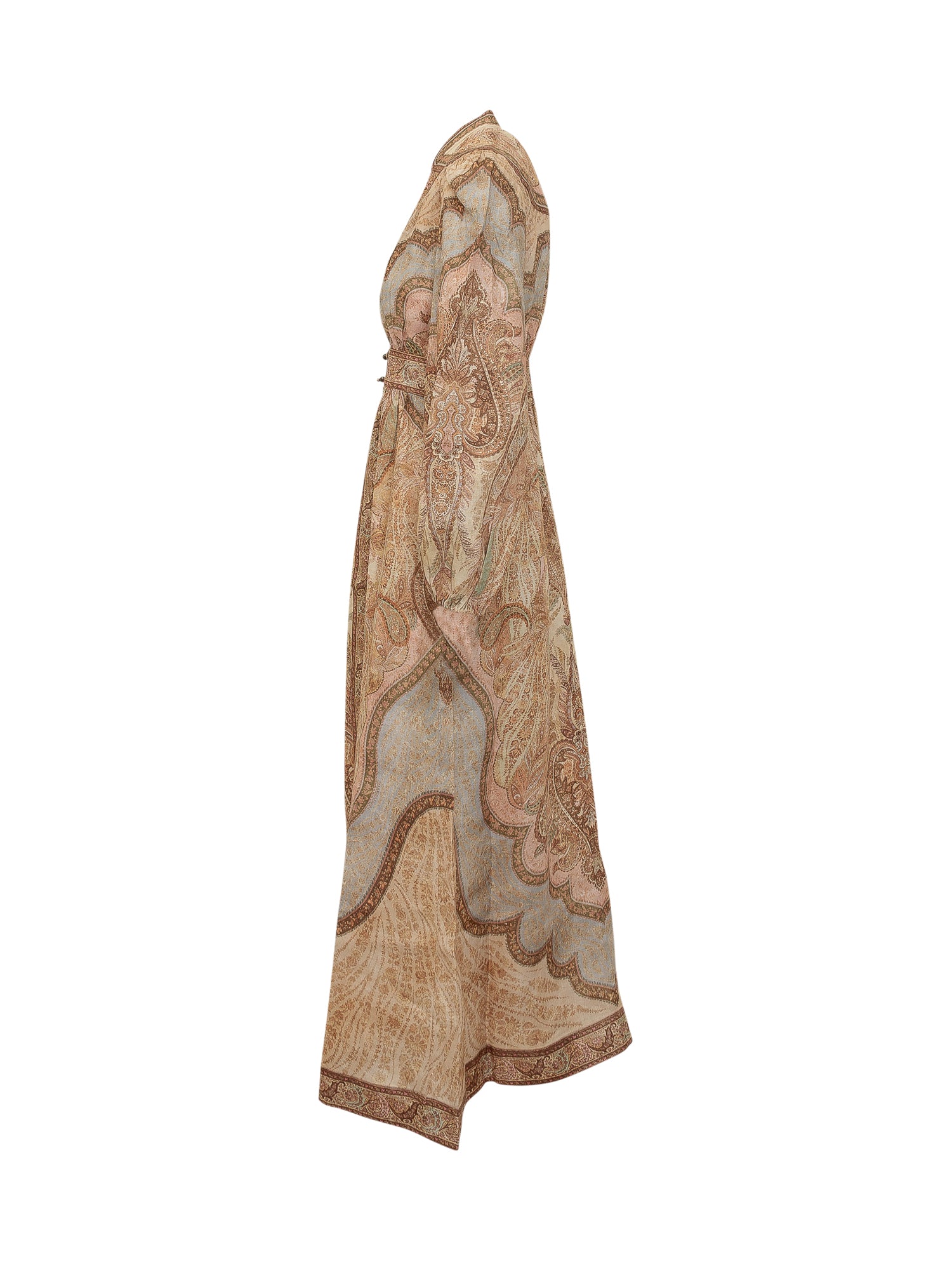 Lightweight paisley-print midi dress with contrasting decorative borders. A defined waistband enhances the silhouette, while soft long sleeves add volume and movement for a polished boho-chic look.
