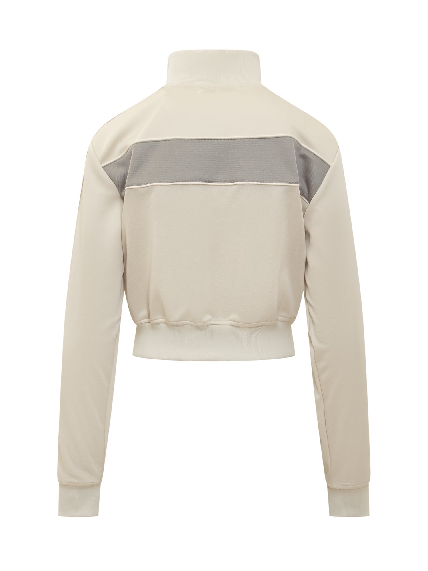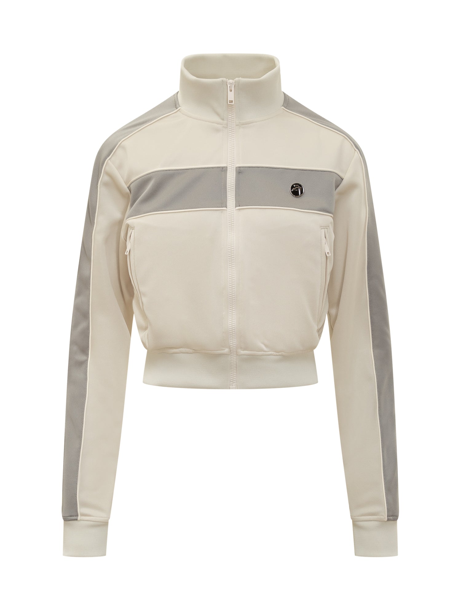 Cropped jacket. Long sleeves. High collar. Zip fastening. Uncle pockets Contrasting bands on chest and sleeves. AMBLEM logo on front. Stretch rib knit collar, hem and cuffs.