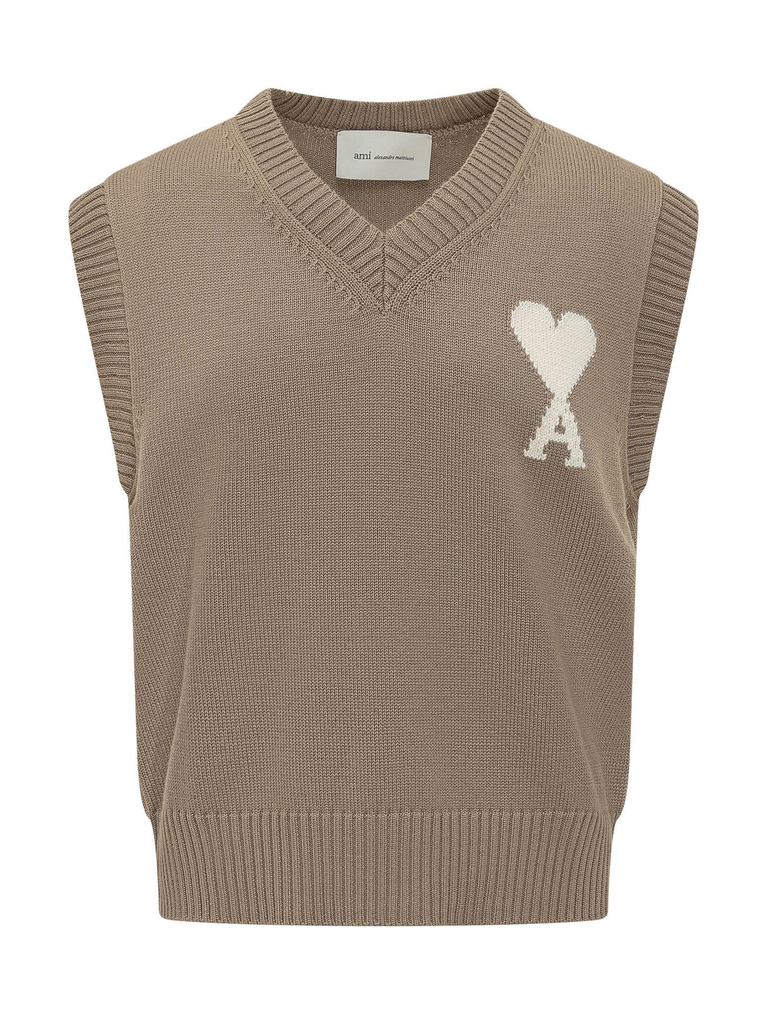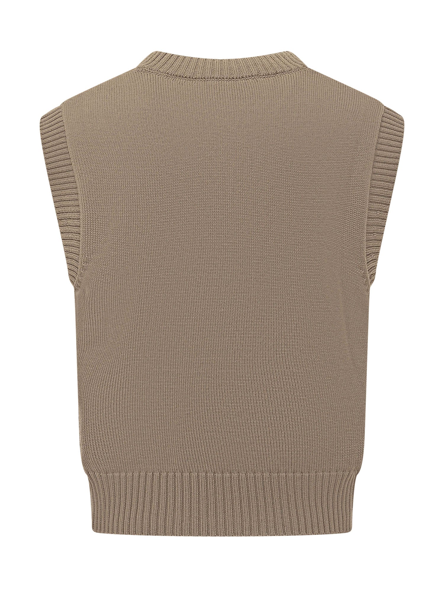 Sleeveless V Sweater featuring a V neck and ribbed trims on collar and hem. Sleeveless design with contrasting intarsia logo on the chest. Versatile contemporary style, perfect for layered or casual looks.