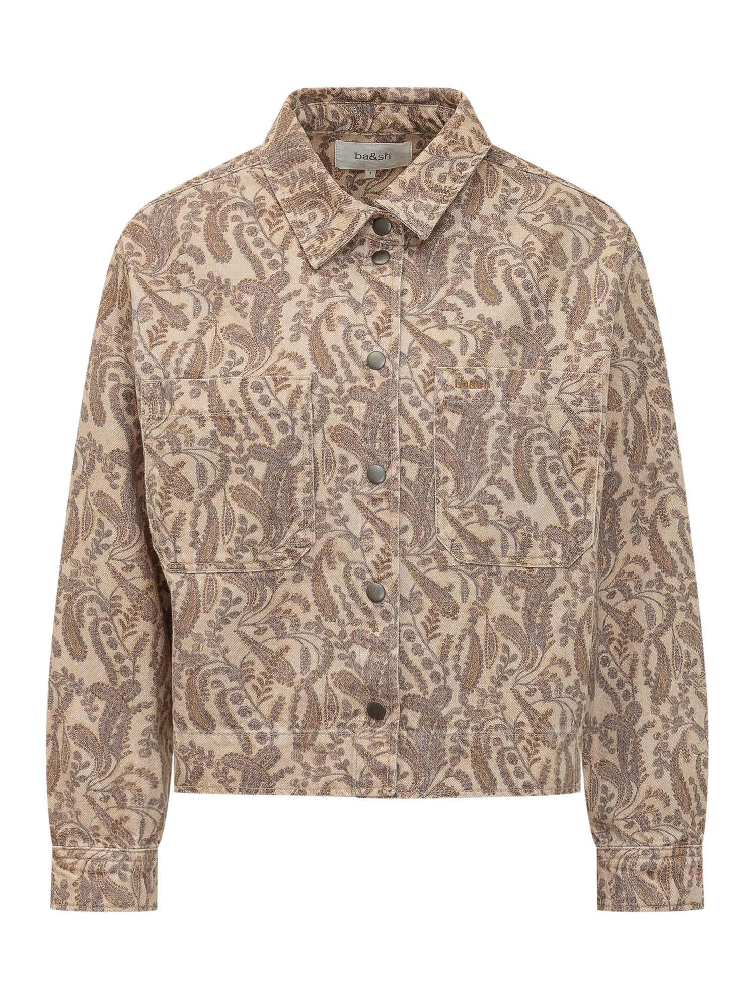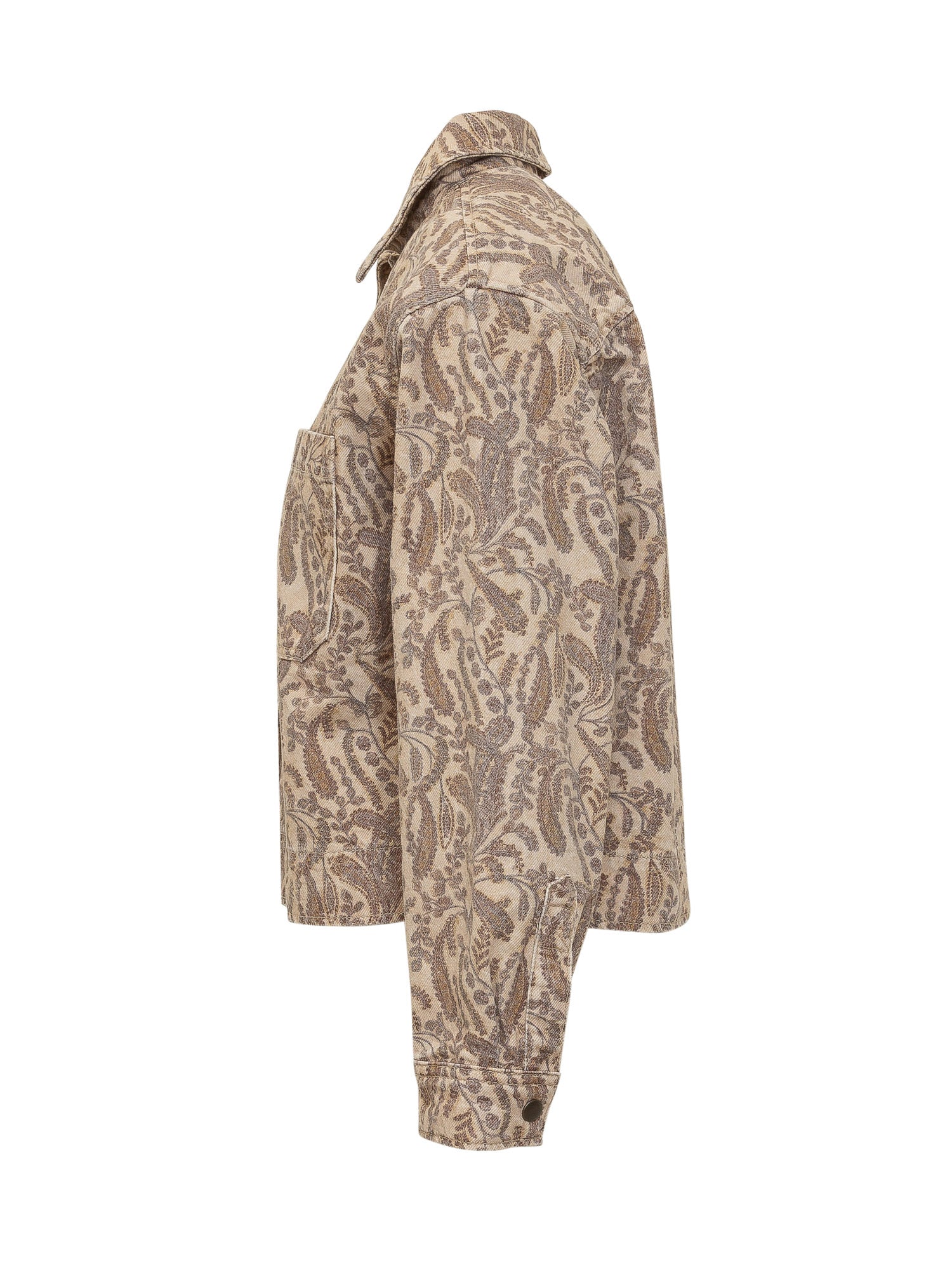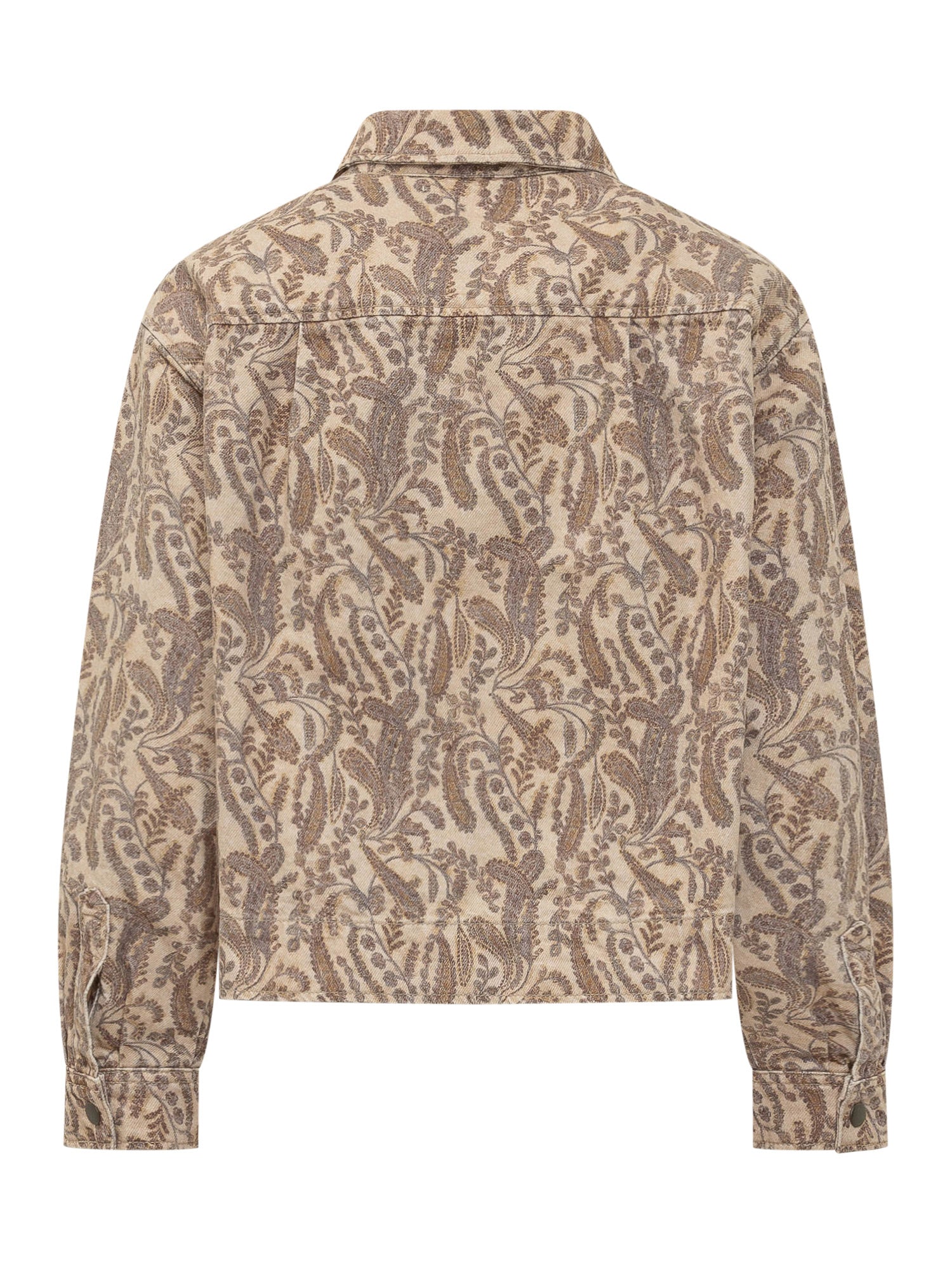 Denim jacket with classic collar and snap button closure. Patch pockets on the chest and all-over paisley print.