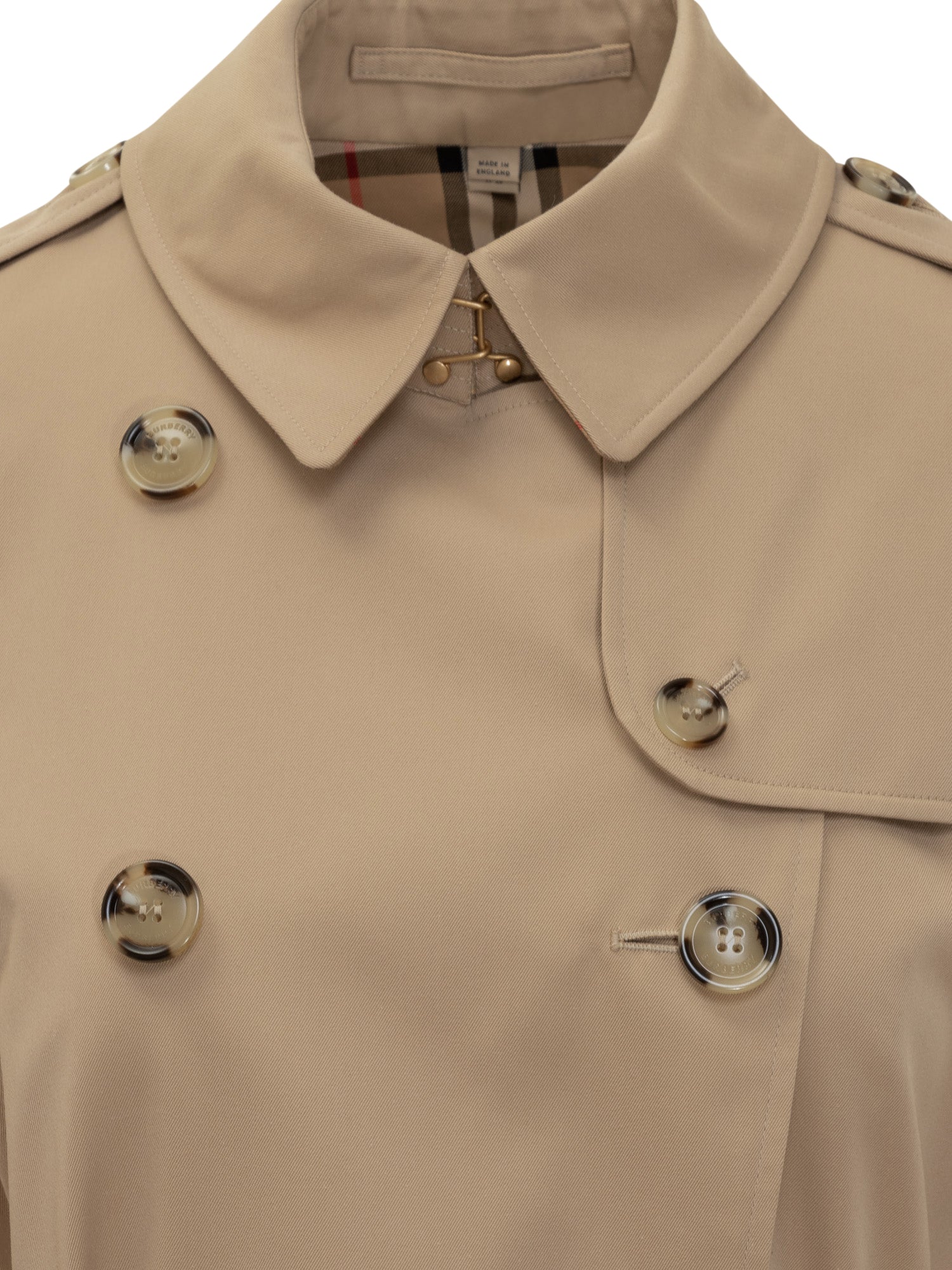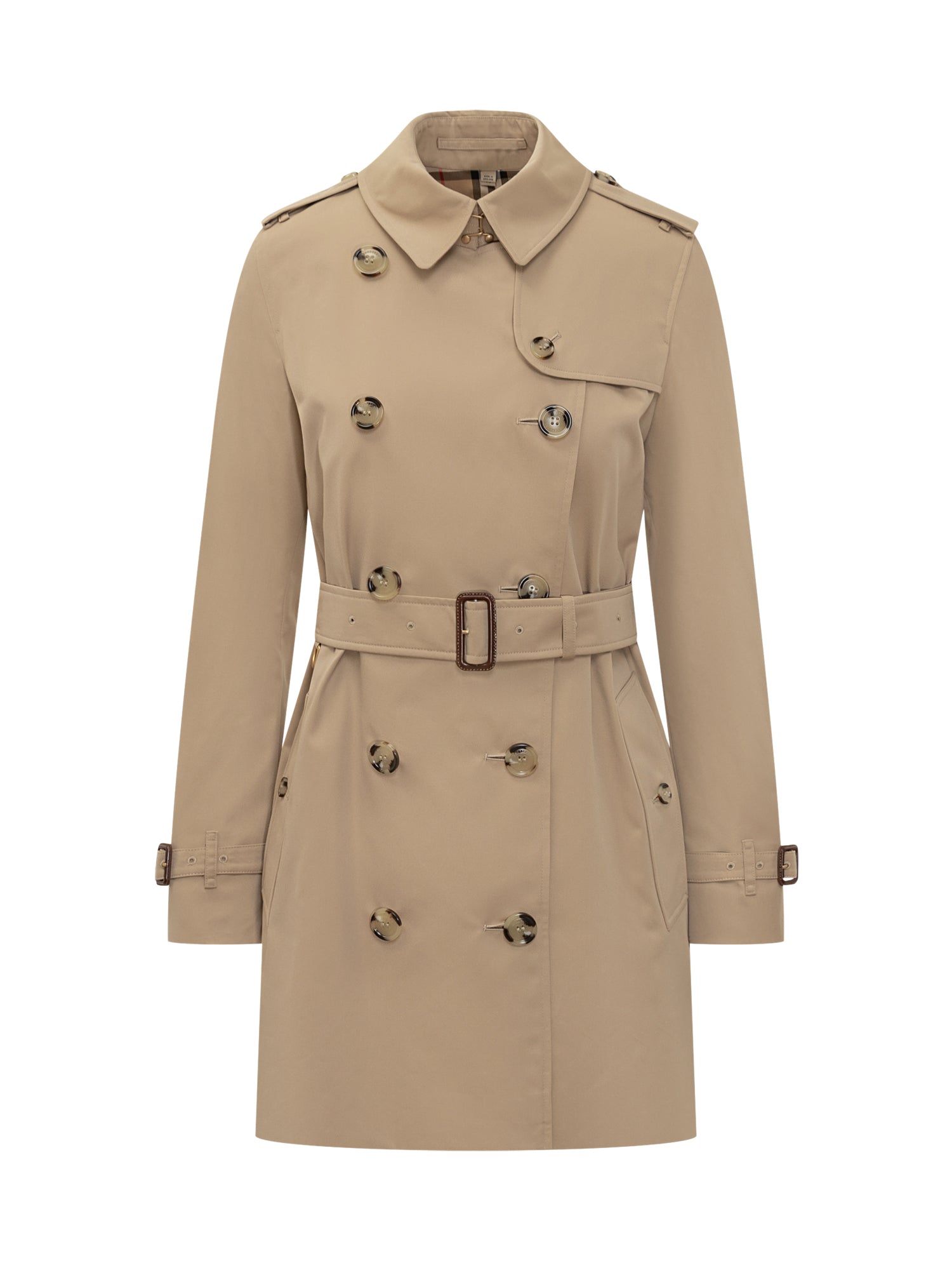 Burberry women s trench coat in beige gabardine with double-breasted front, waist belt, and epaulettes.