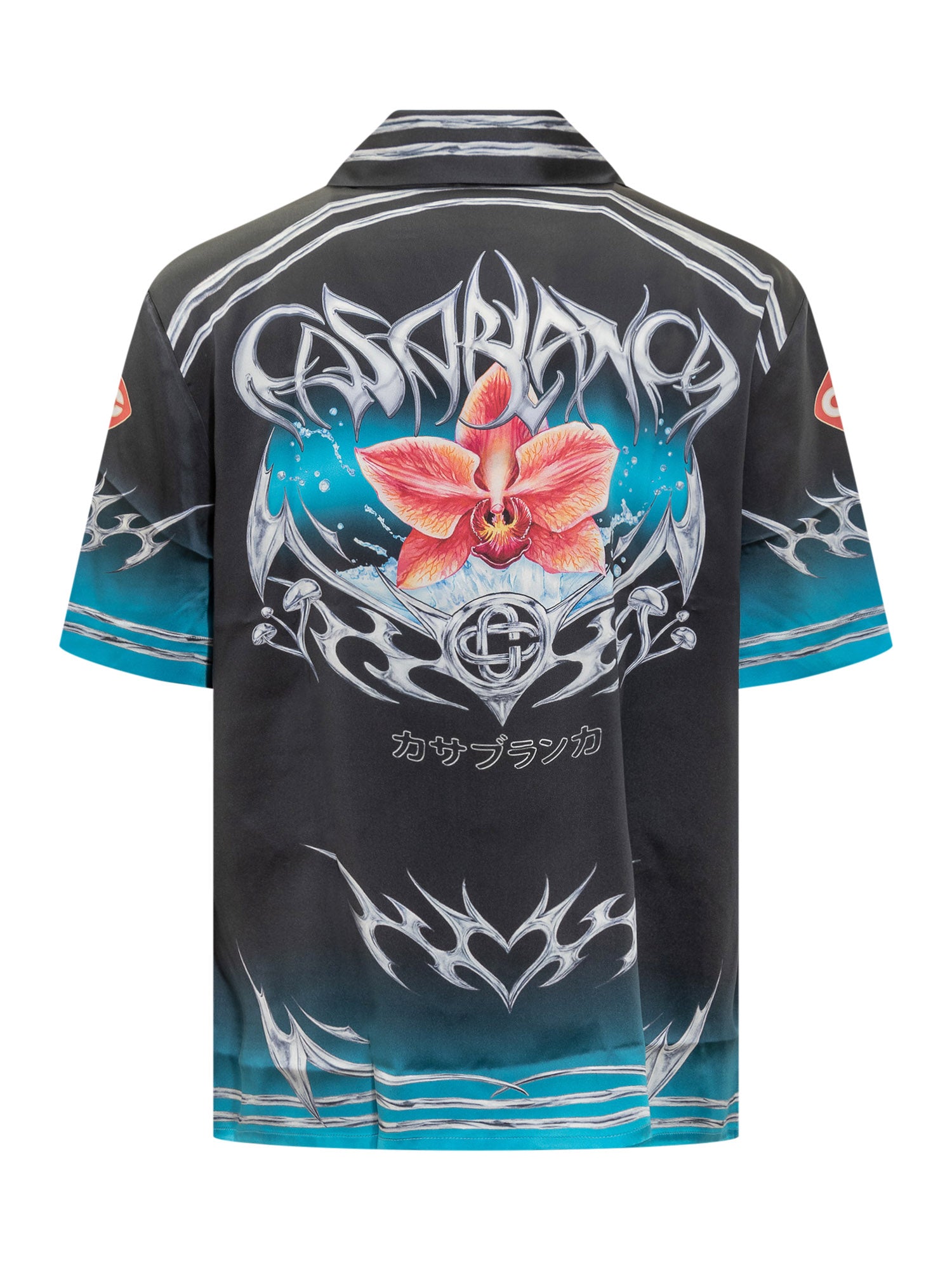 Short-sleeved silk shirt by Casablanca with floral artwork and abstract graphic details. Features a Cuban collar and relaxed fit.