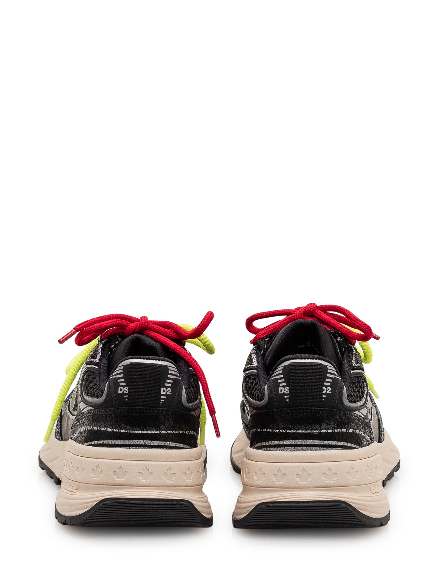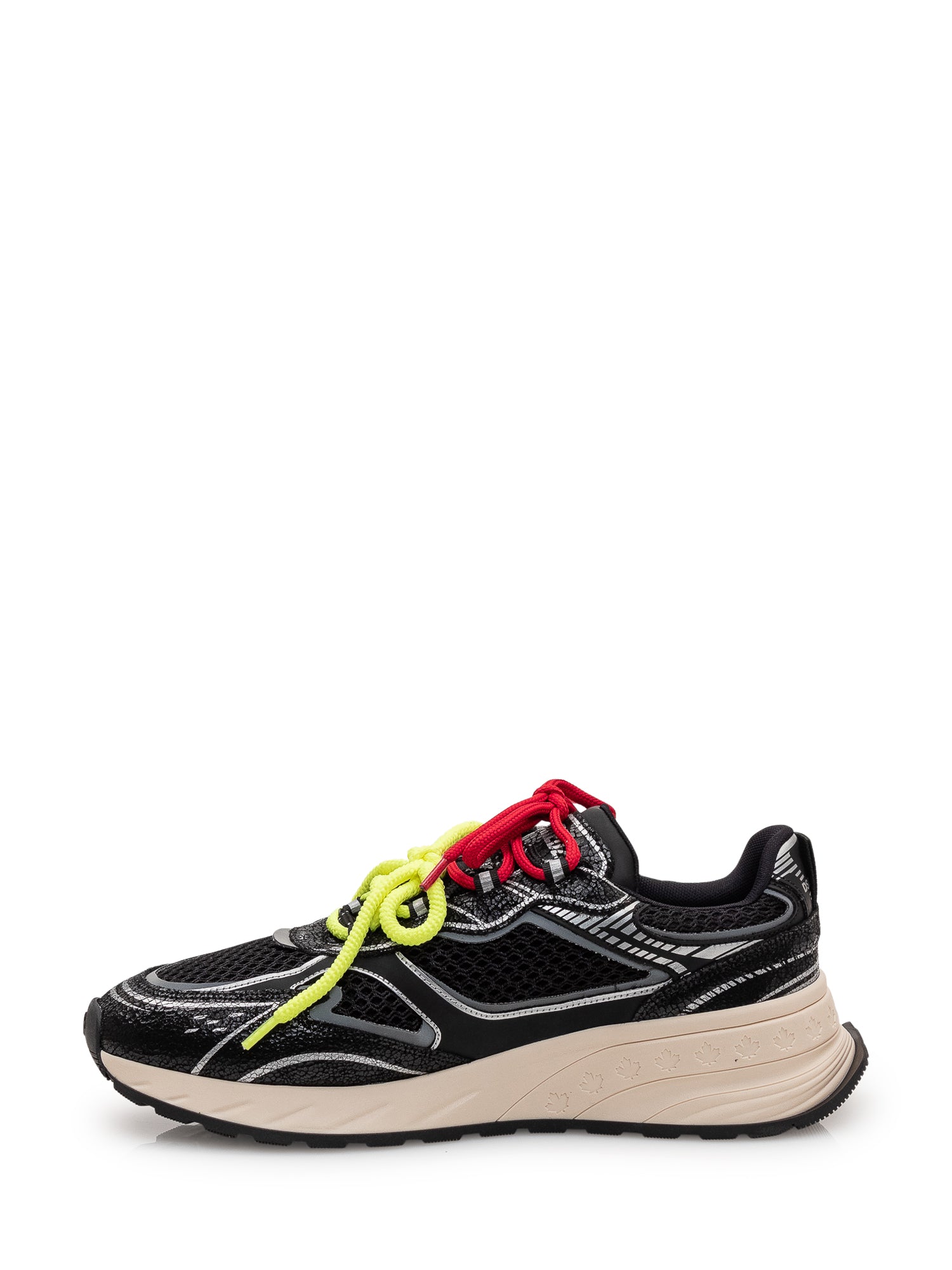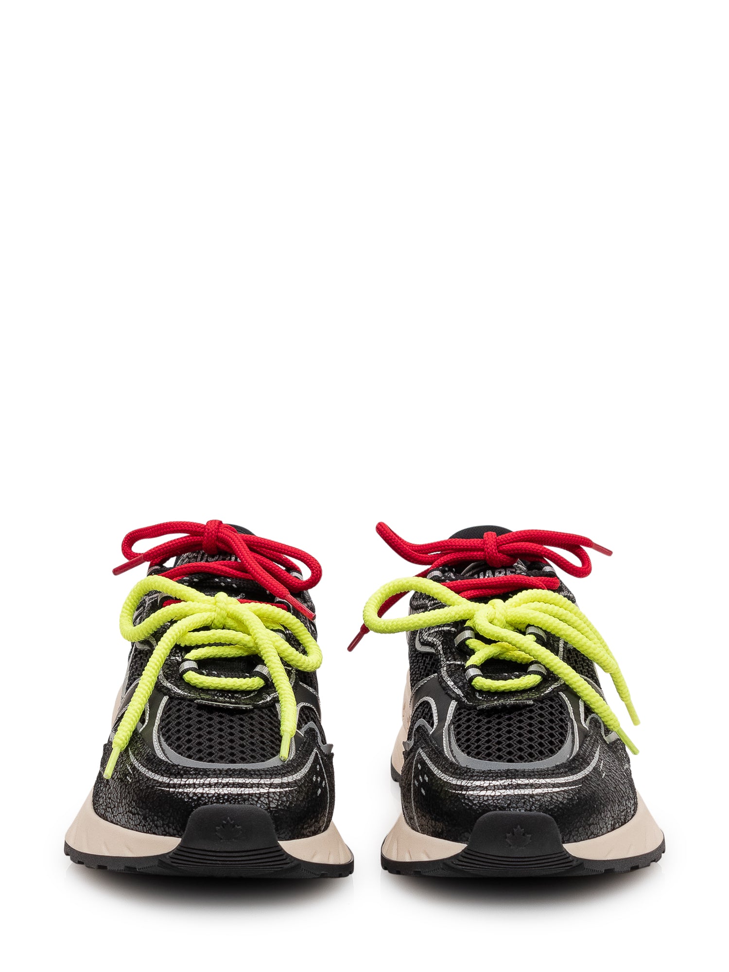 Sporty, contemporary sneakers featuring a crackle effect, contrast graphic details, and multicolor laces.