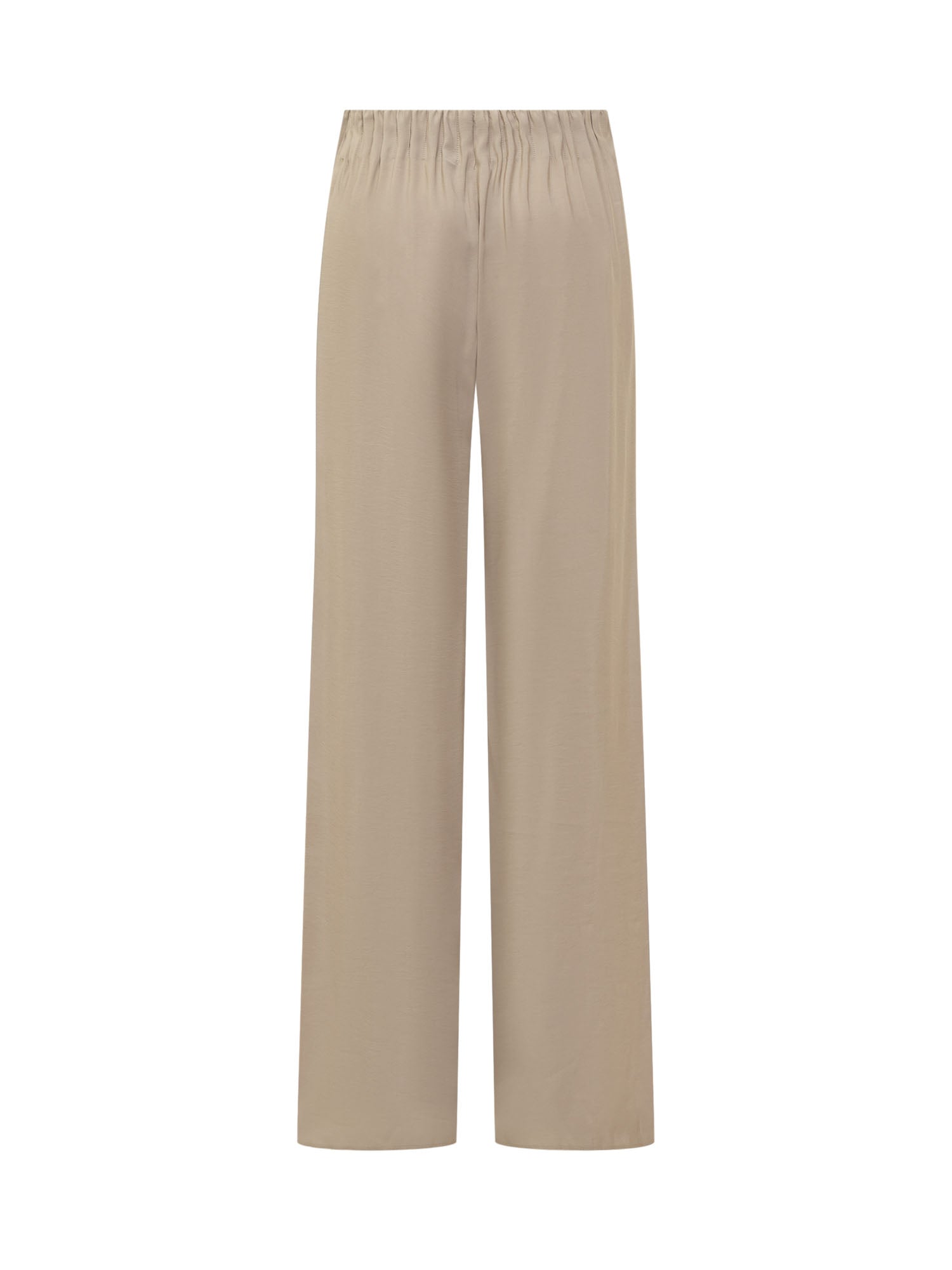 Beige long trouser. Elastic at the waistband. Pleated waistband. Flush pockets at the sides. Wide leg.