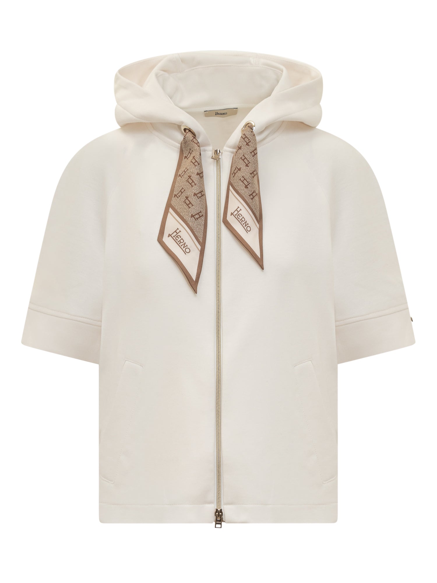 Short-sleeved sweatshirt. Hood with scarf. Zipper closure. Two pockets on front. Monogram scarf.