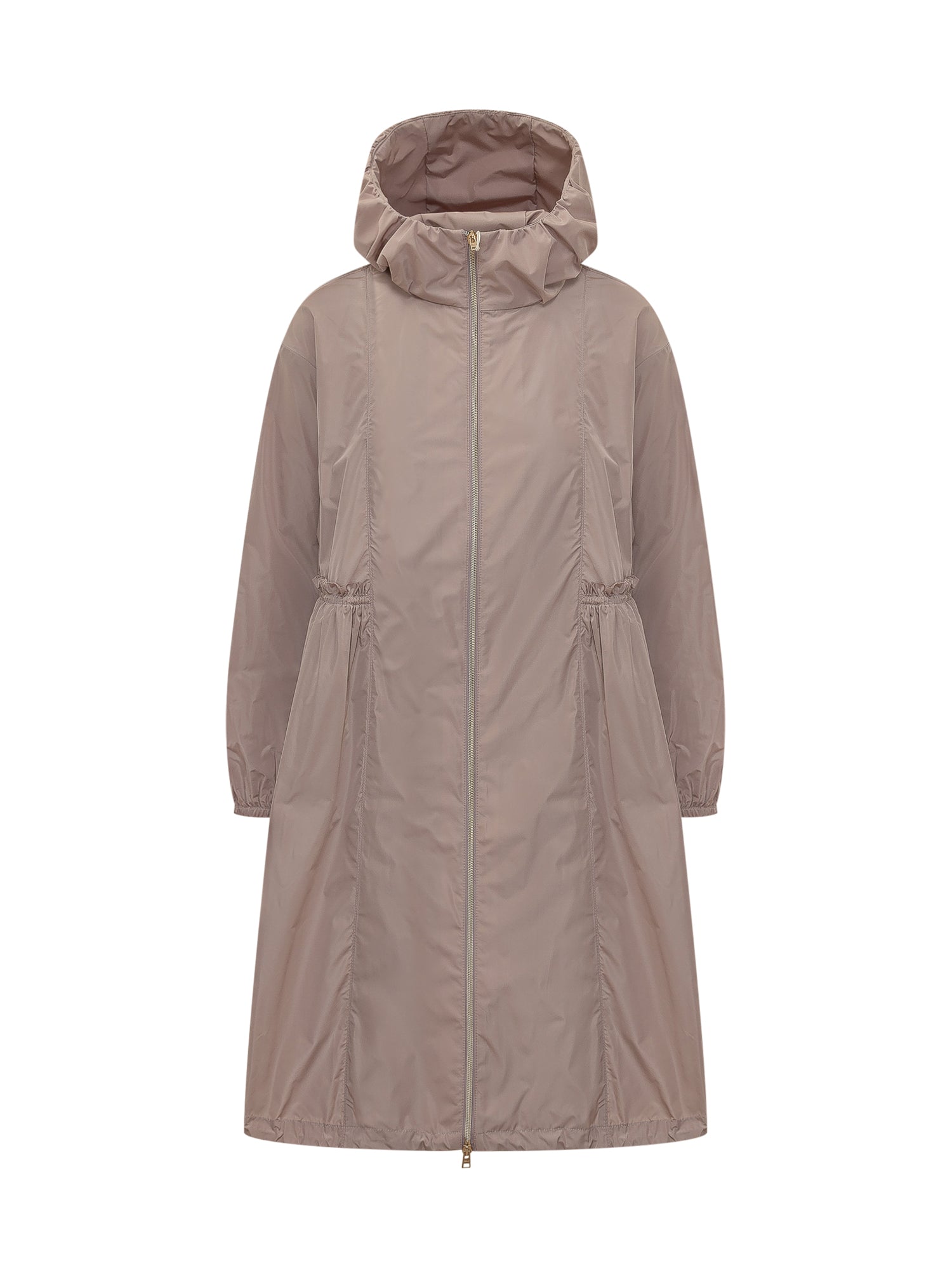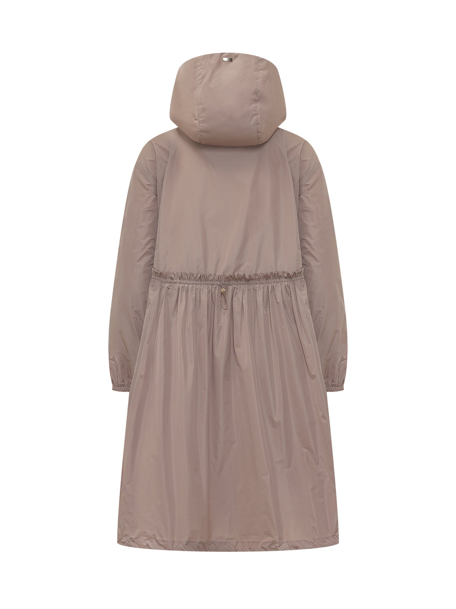 Lightweight long parka with hood and full zip closure. Fluid silhouette with gathered waist detailing for a flattering fit.