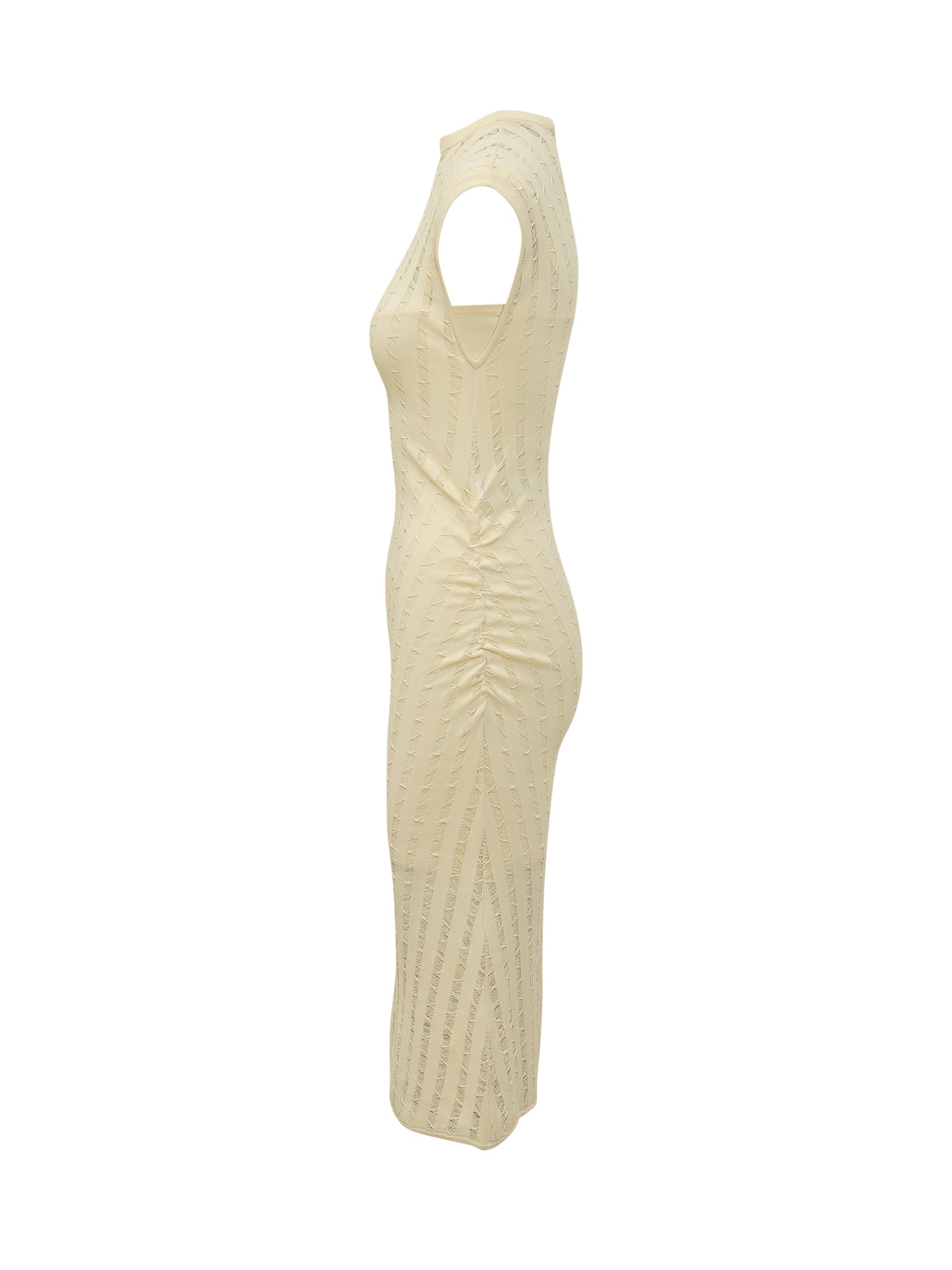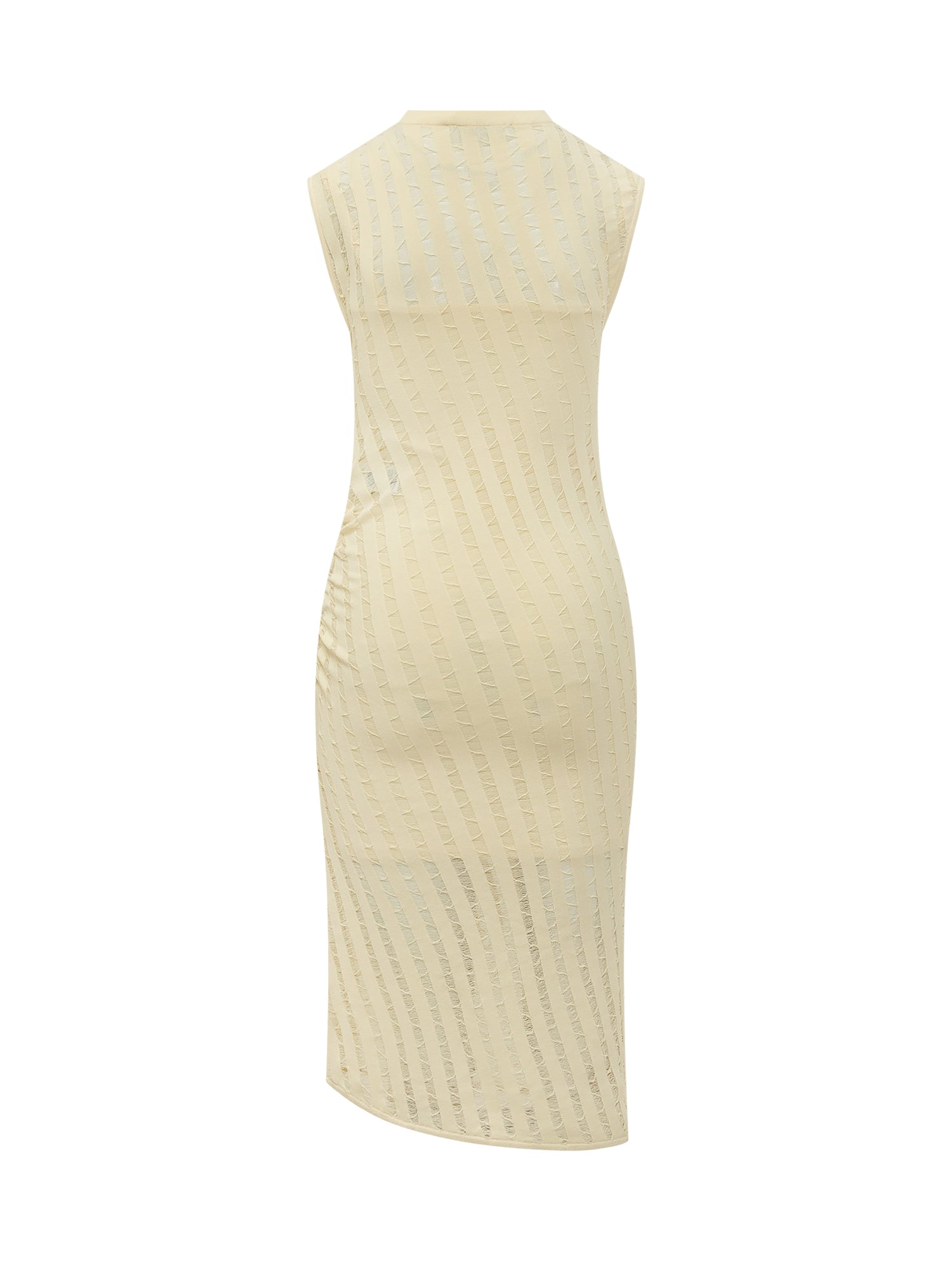 Sleeveless long dress with high neckline. The vertical openwork pattern defines a tapered silhouette.