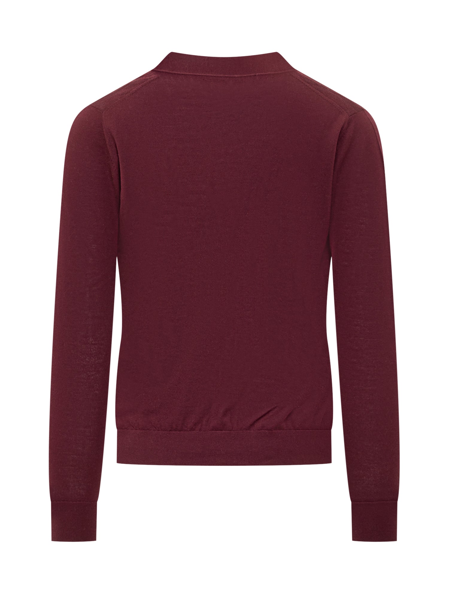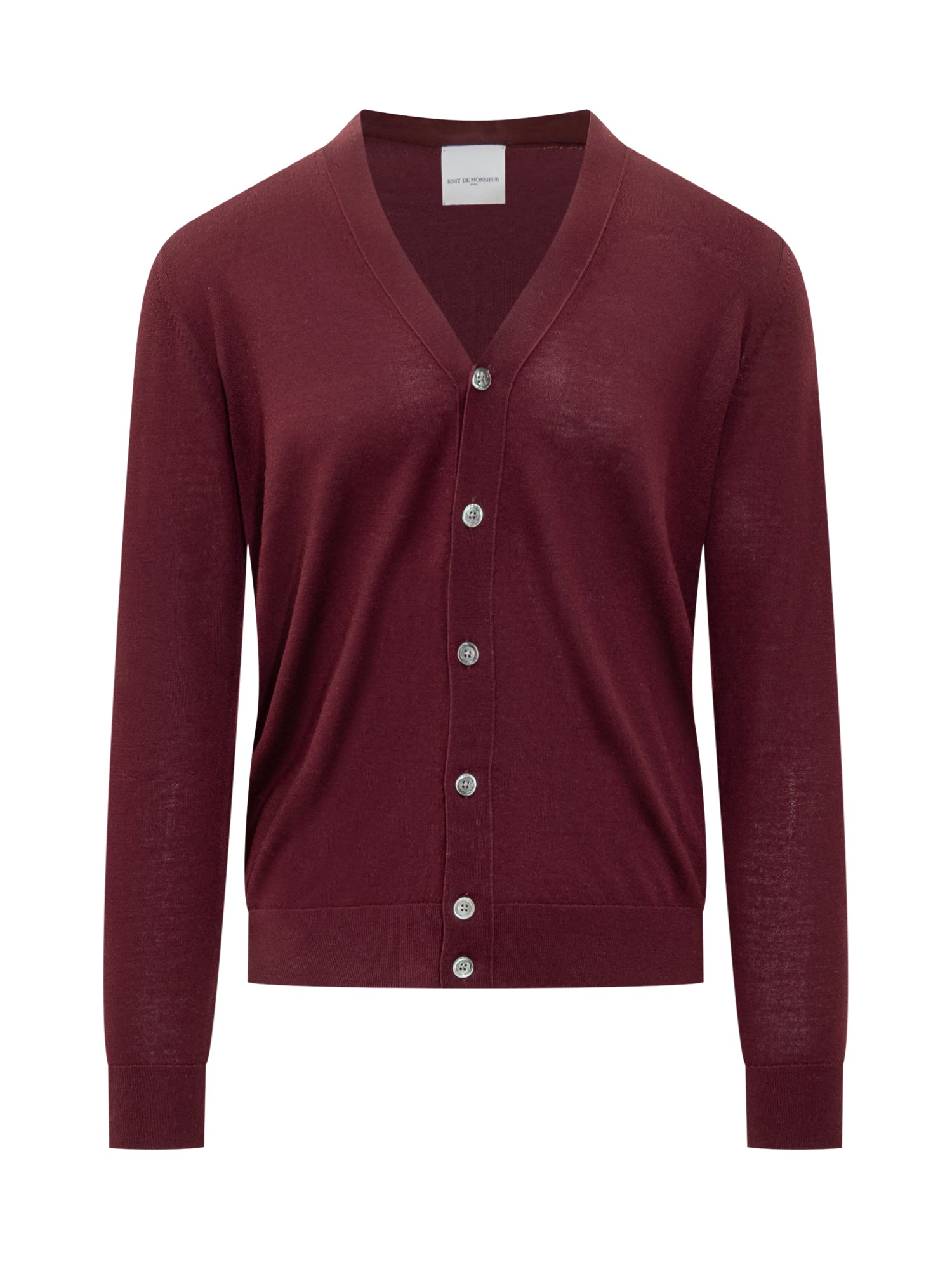 Knit De Monsieur burgundy wool cardigan with V-neck and button closure.