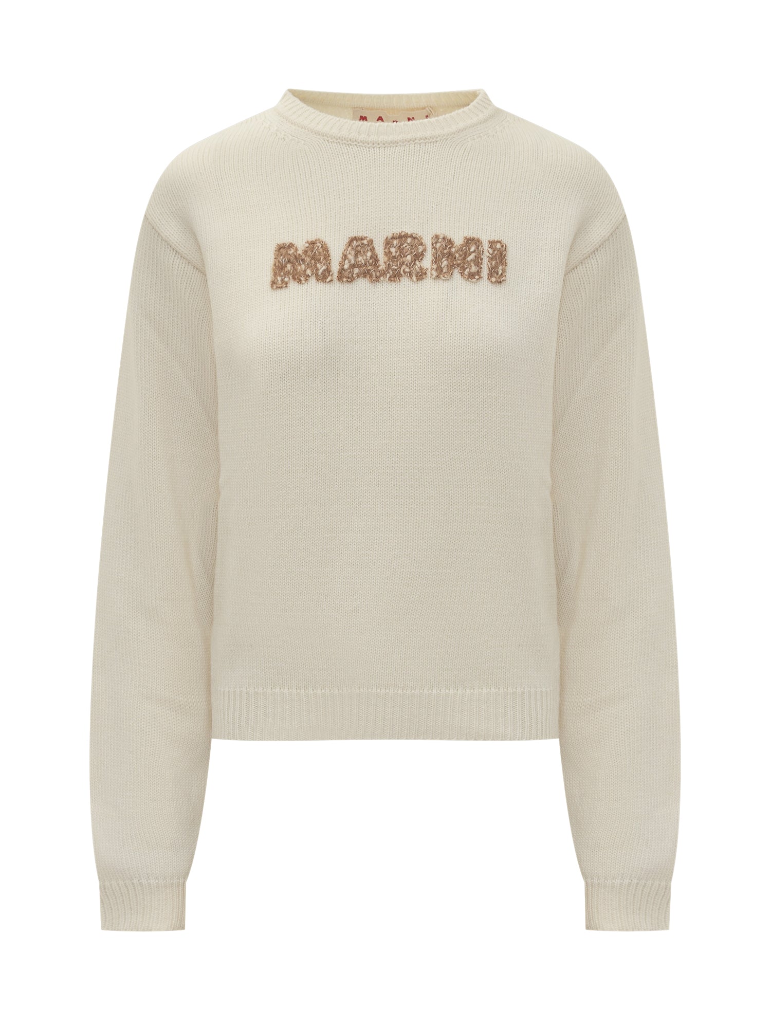 Marni cotton sweater in ivory with bouclé-effect embroidered logo on chest.