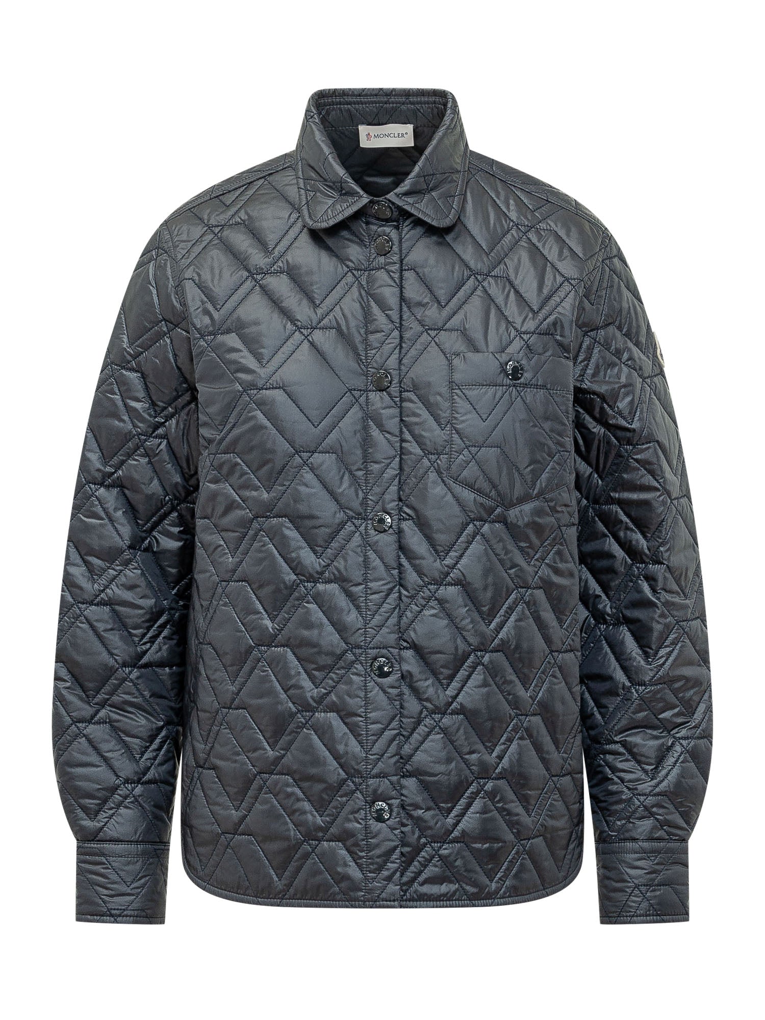 Quilted shirt jacket crafted from nylon with an all-over geometric pattern.