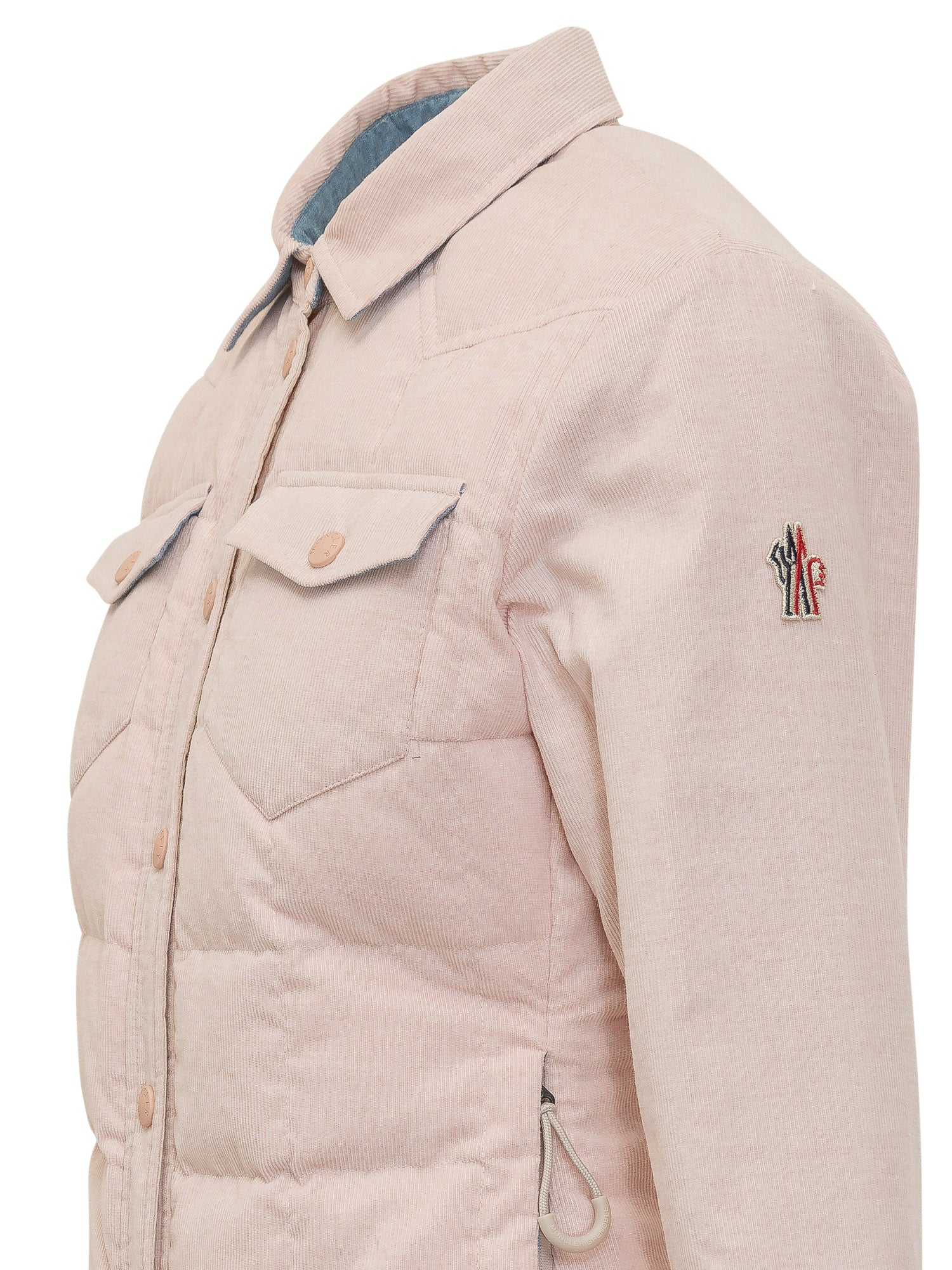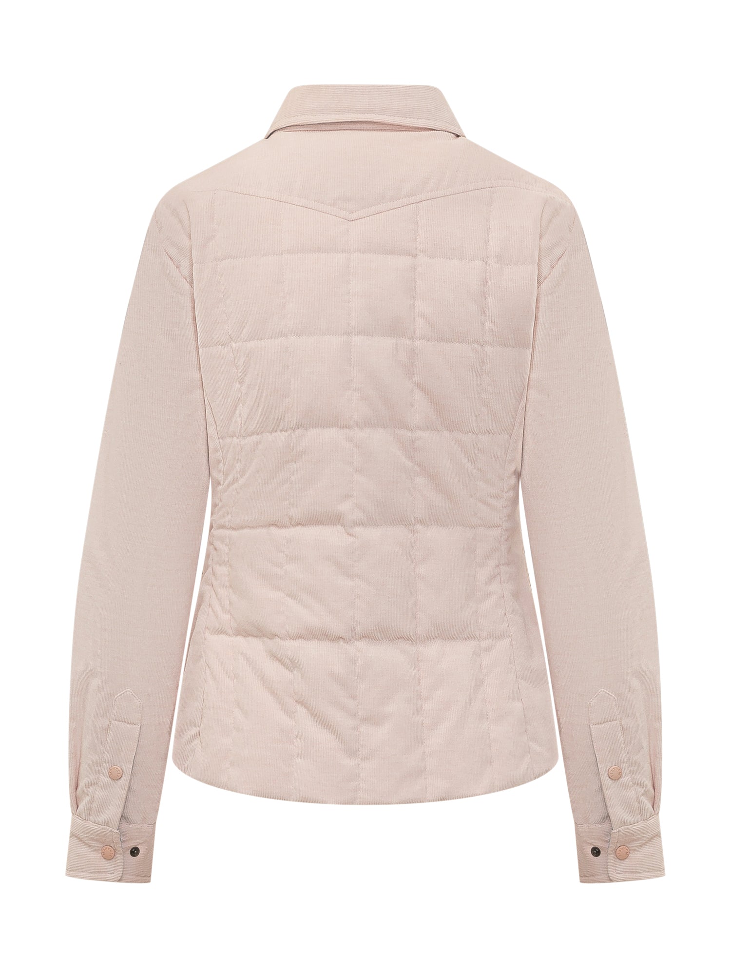 Jacket with classic collar and front snap button closure. Long sleeves with chest flap patch pockets and quilted lower section. Straight cut and contemporary design.