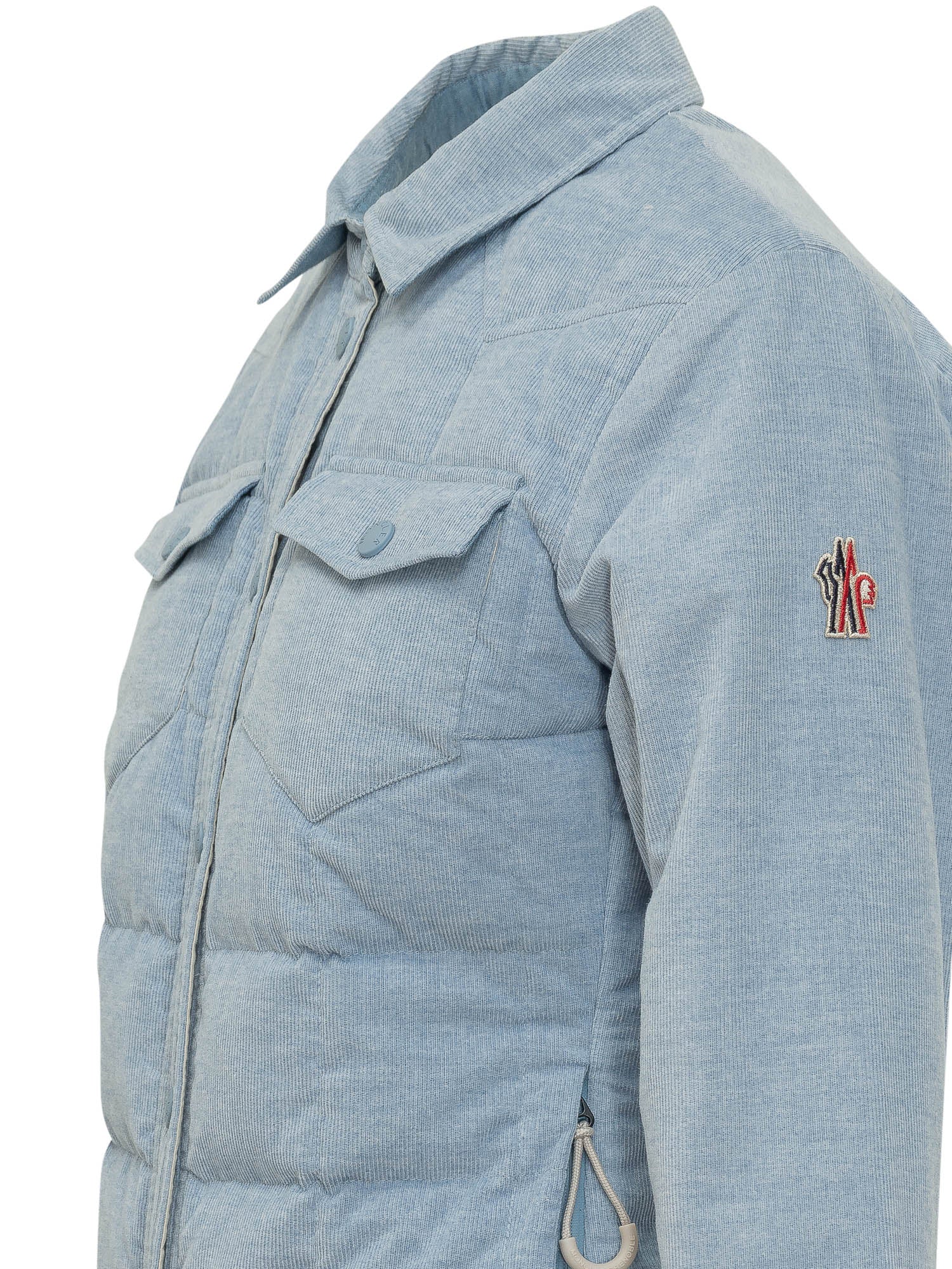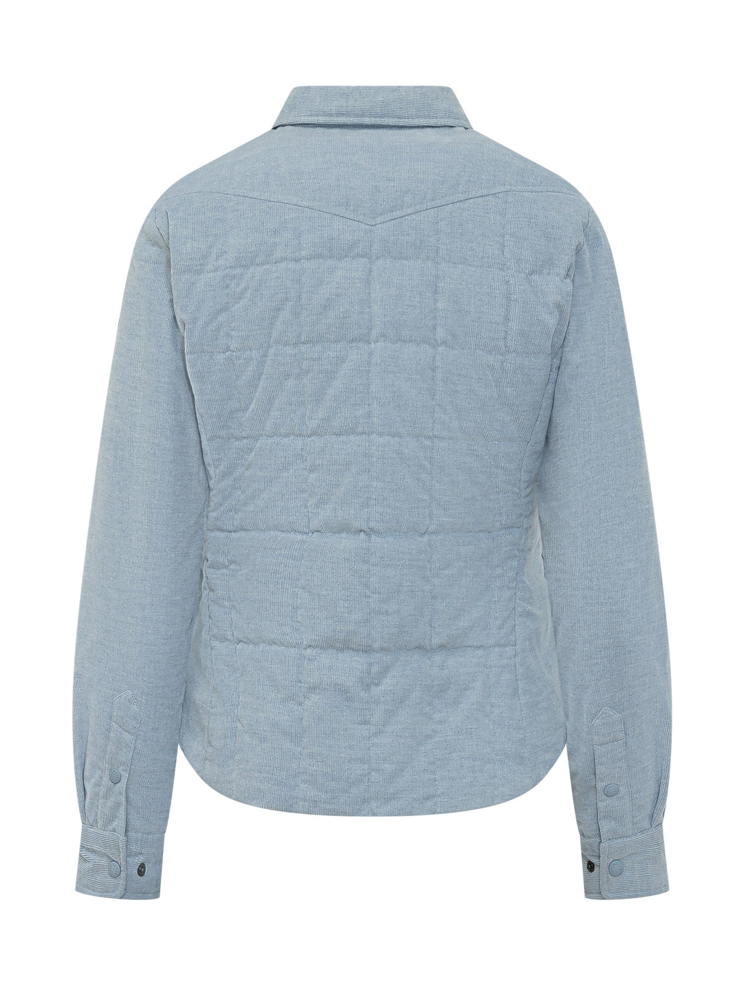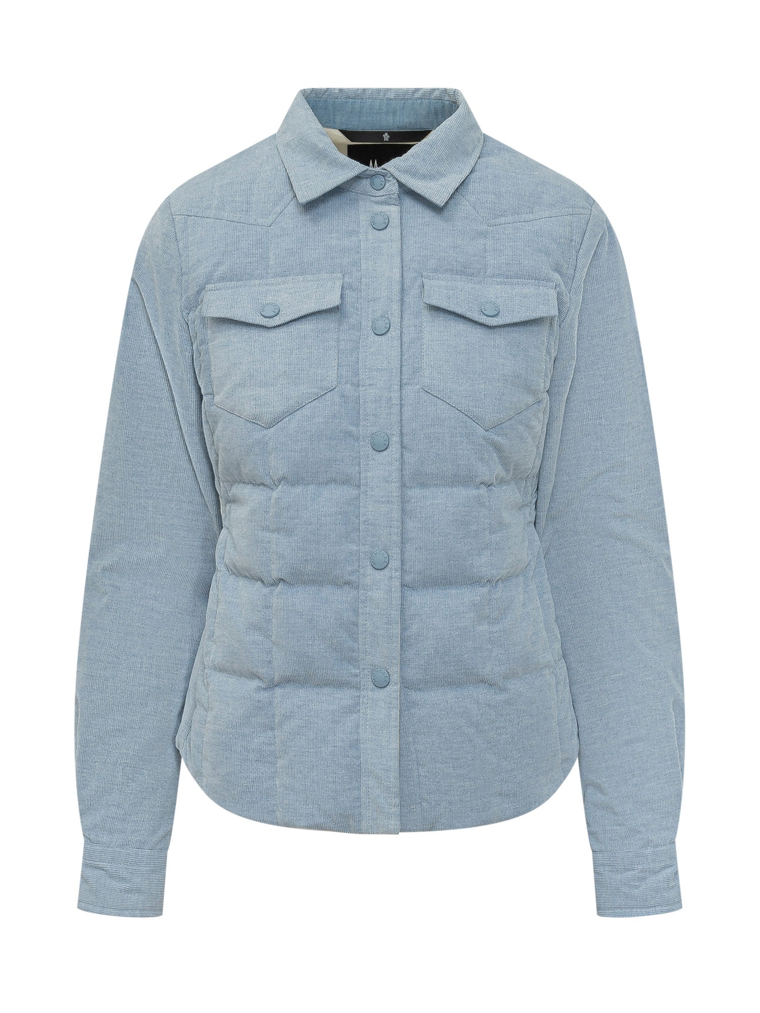 Jacket with classic collar and front snap button closure. Long sleeves with chest flap patch pockets and quilted lower section. Straight cut and contemporary design.