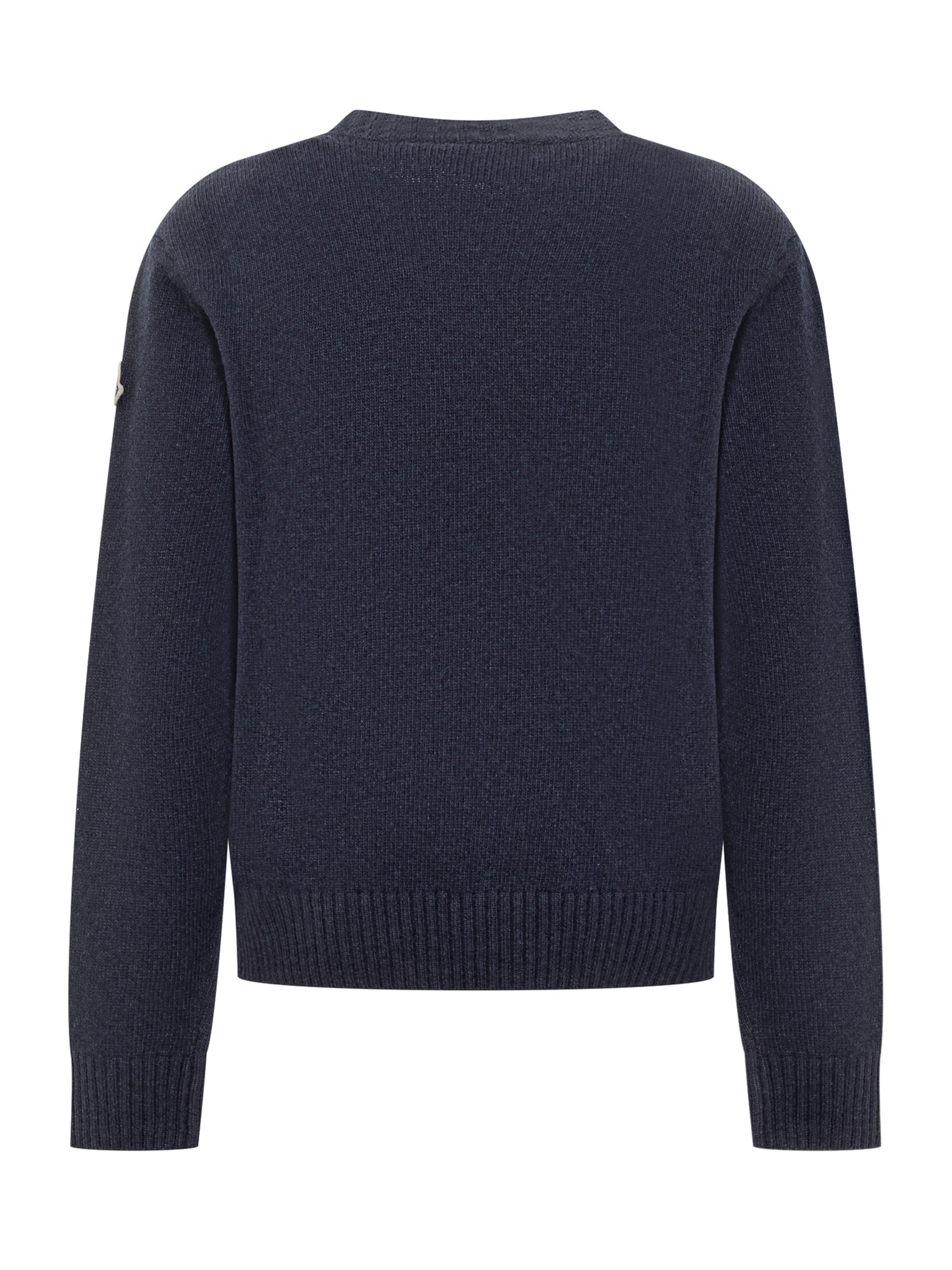 Moncler crew-neck sweater for boys in navy blue wool. Features a minimalist design with the iconic logo on the sleeve and tricolor detail on the shoulder.