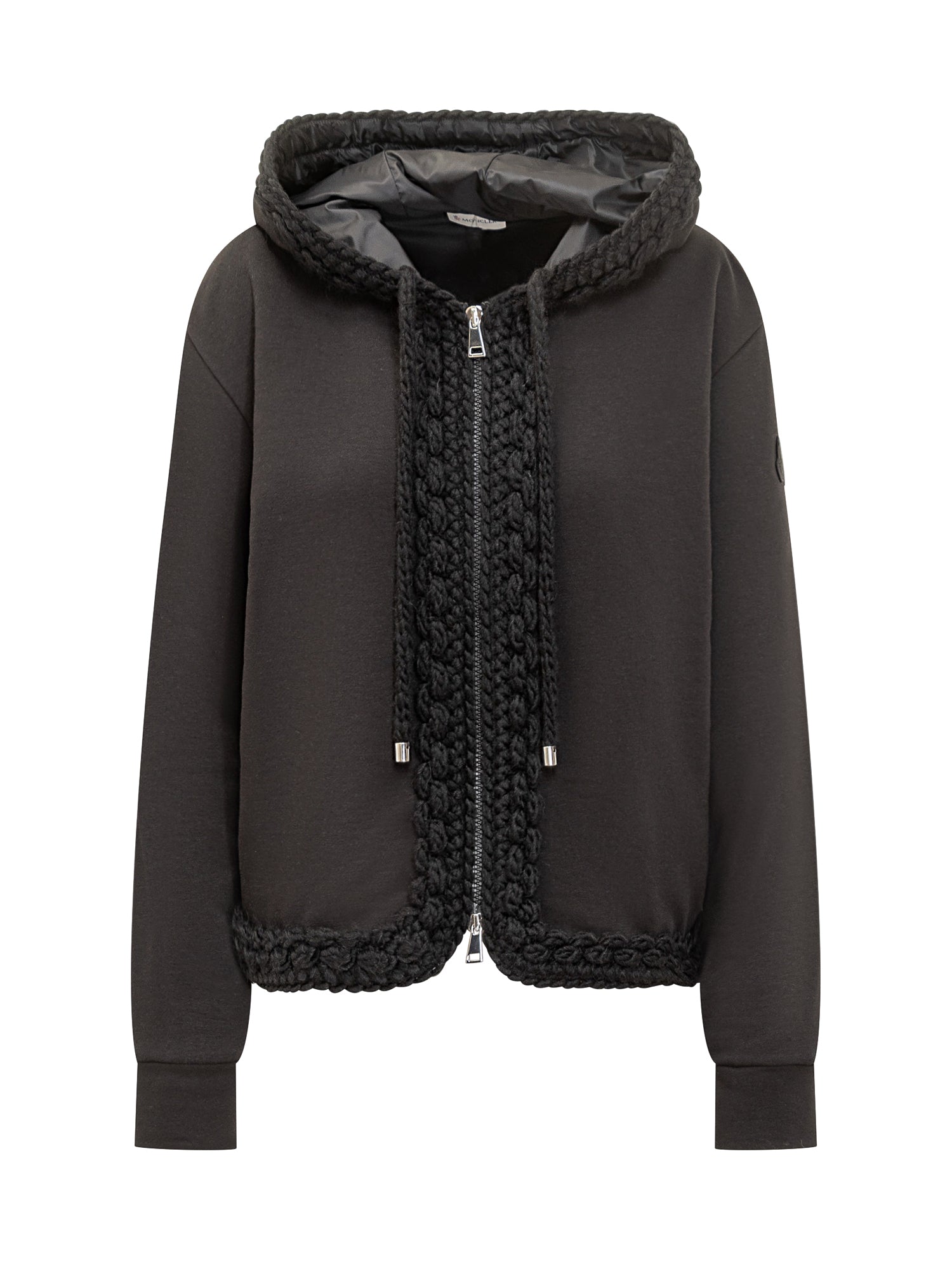 Moncler black cotton hoodie featuring braided trim, adjustable hood and zip closure. Logo patch on the sleeve.