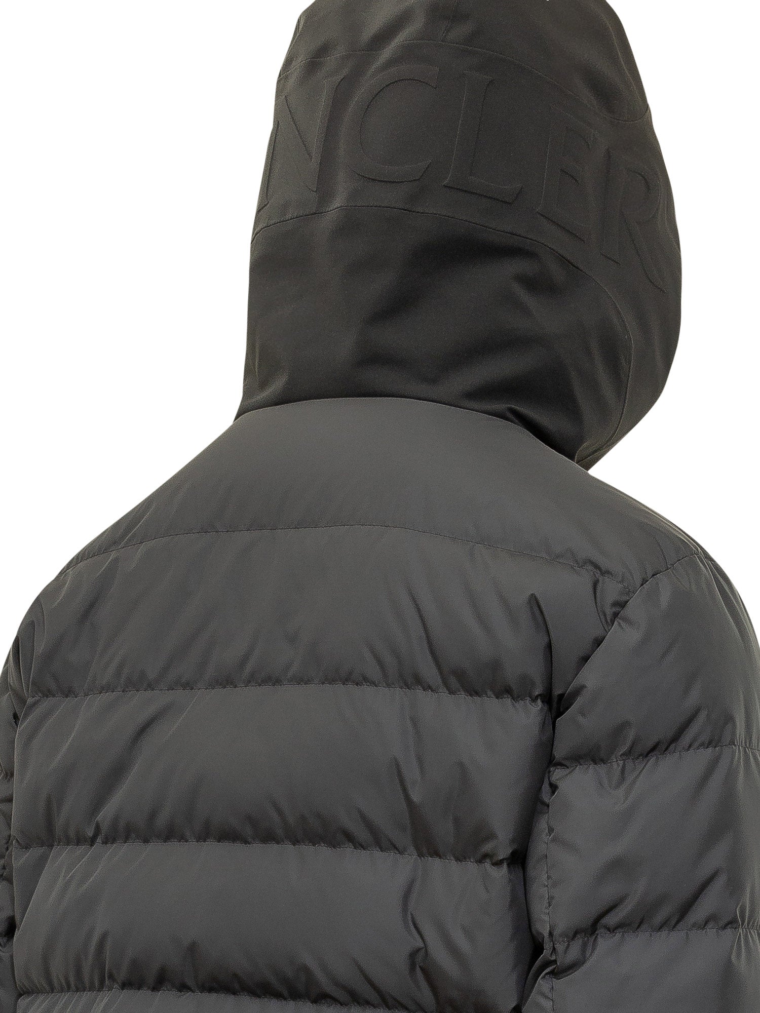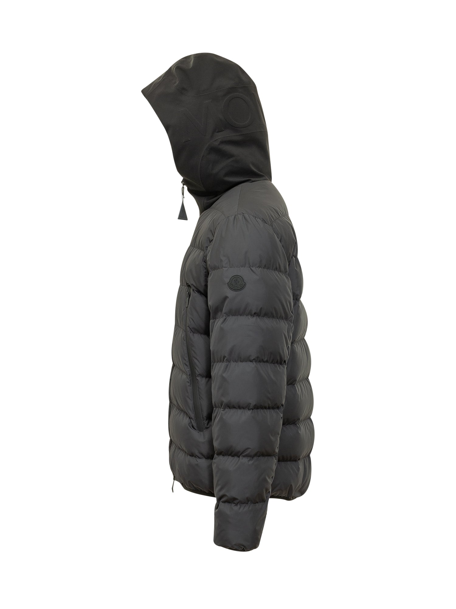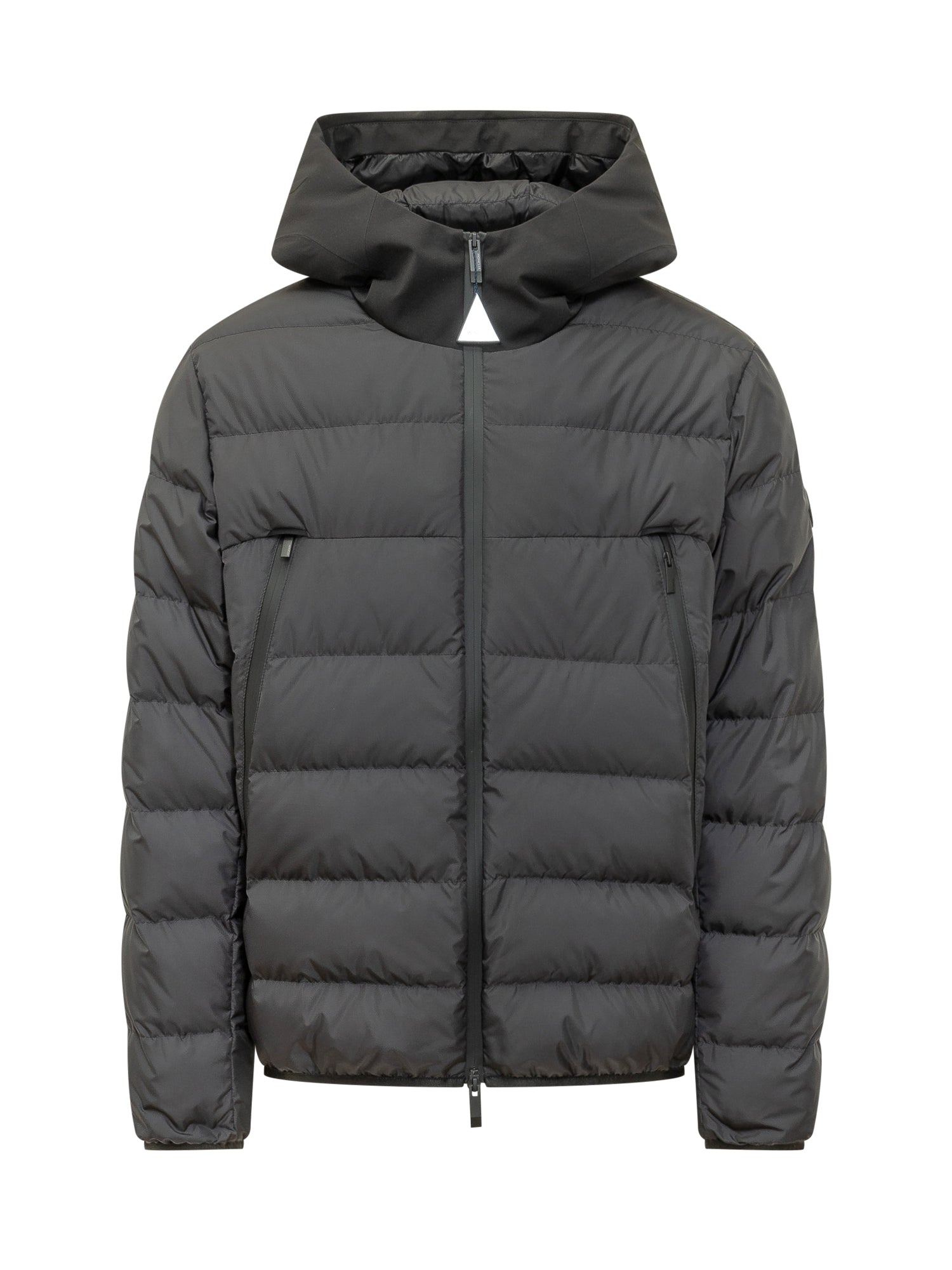 Down puffer jacket with horizontal baffles and a fixed hood. Features a clean, technical look with a two-way front zip, zipped side pockets.