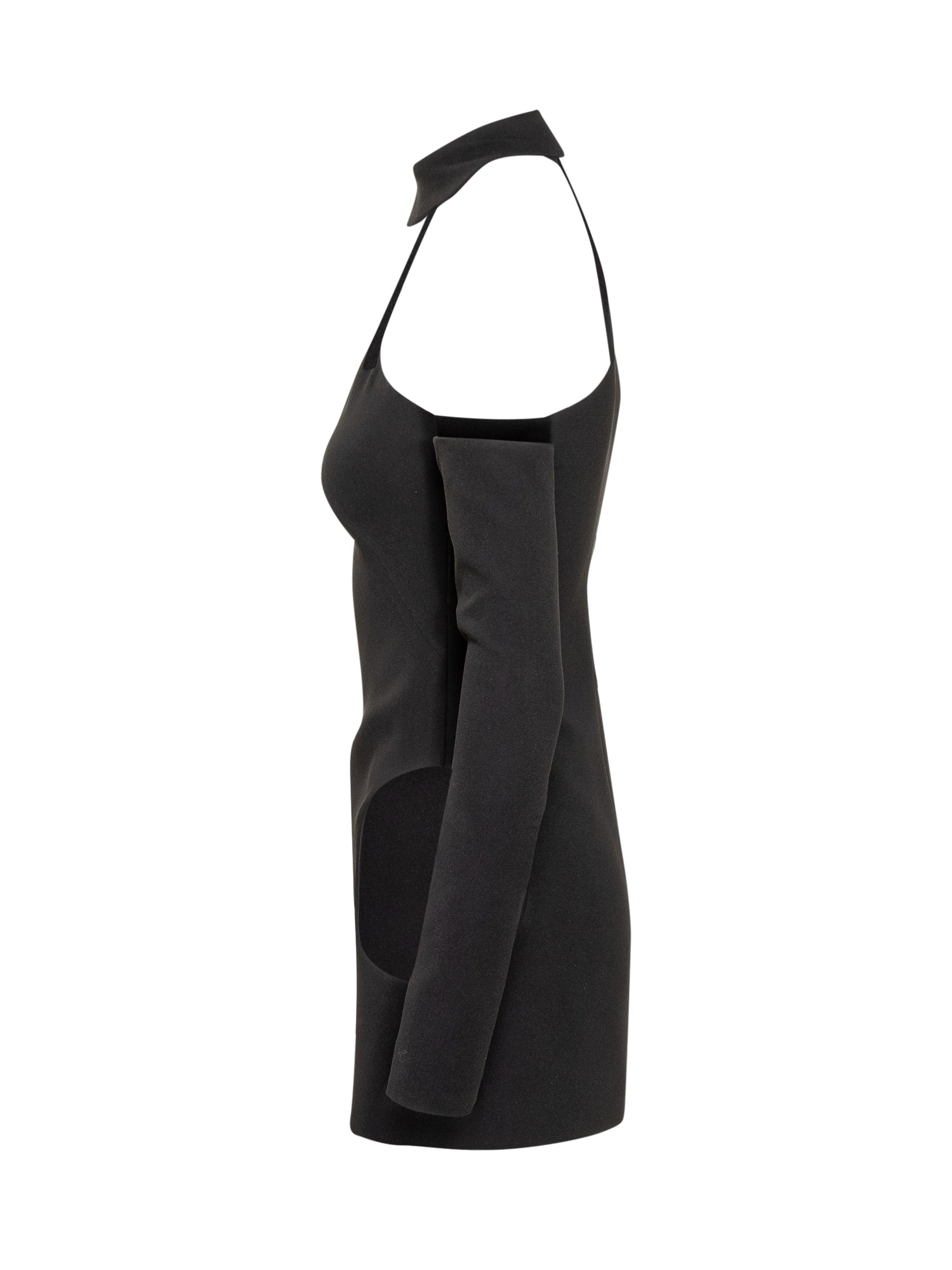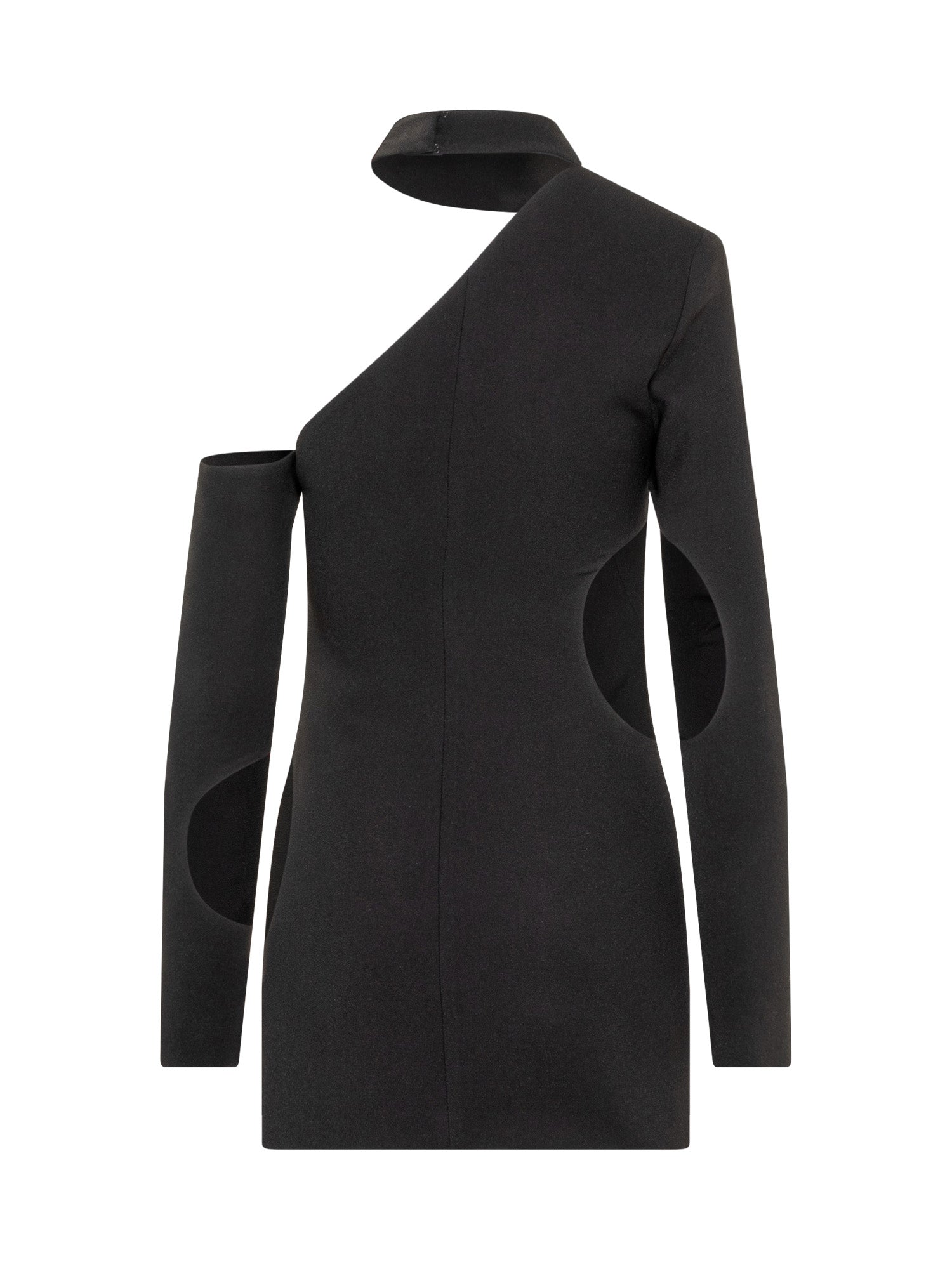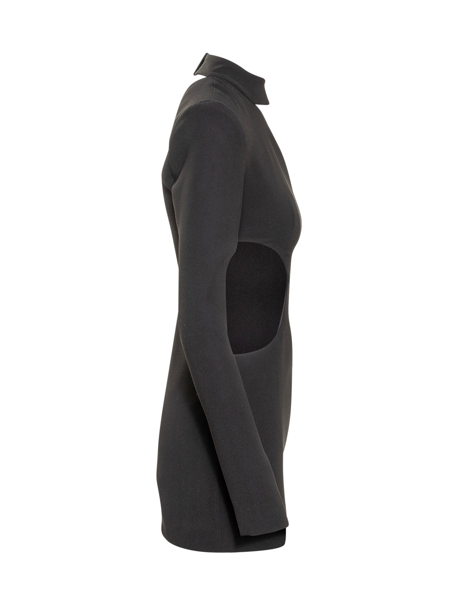 Midi dress. Wide neckline on the shoulder. Hook closure on the back of the neck. Cut-out on the sleeves and sides.