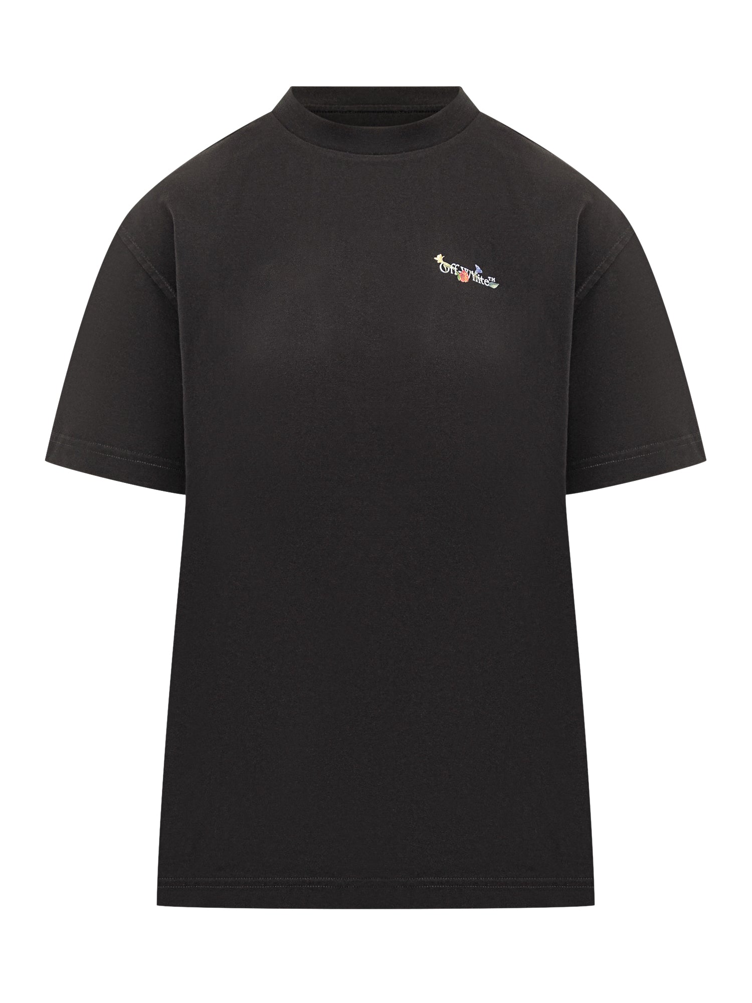Off-White black cotton T-shirt featuring a small embroidered floral logo on the chest.
