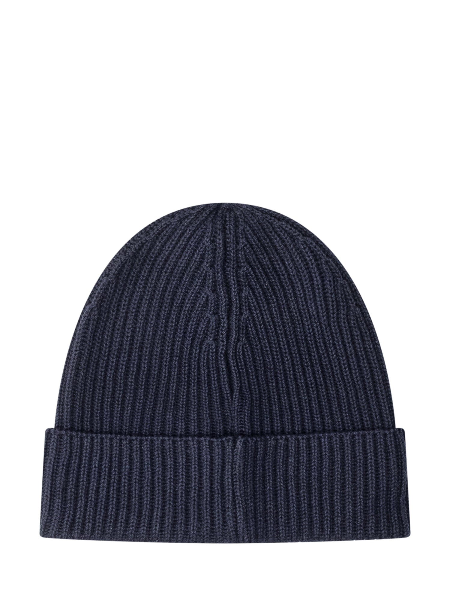 Polo Ralph Lauren beanie in blue ribbed wool with turn-up hem and iconic red embroidered logo.