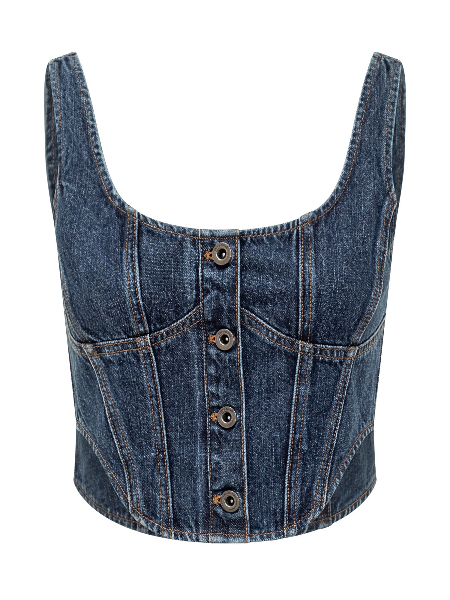 Structured denim corset top with contrast stitching and front button closure. A versatile piece that enhances the silhouette.