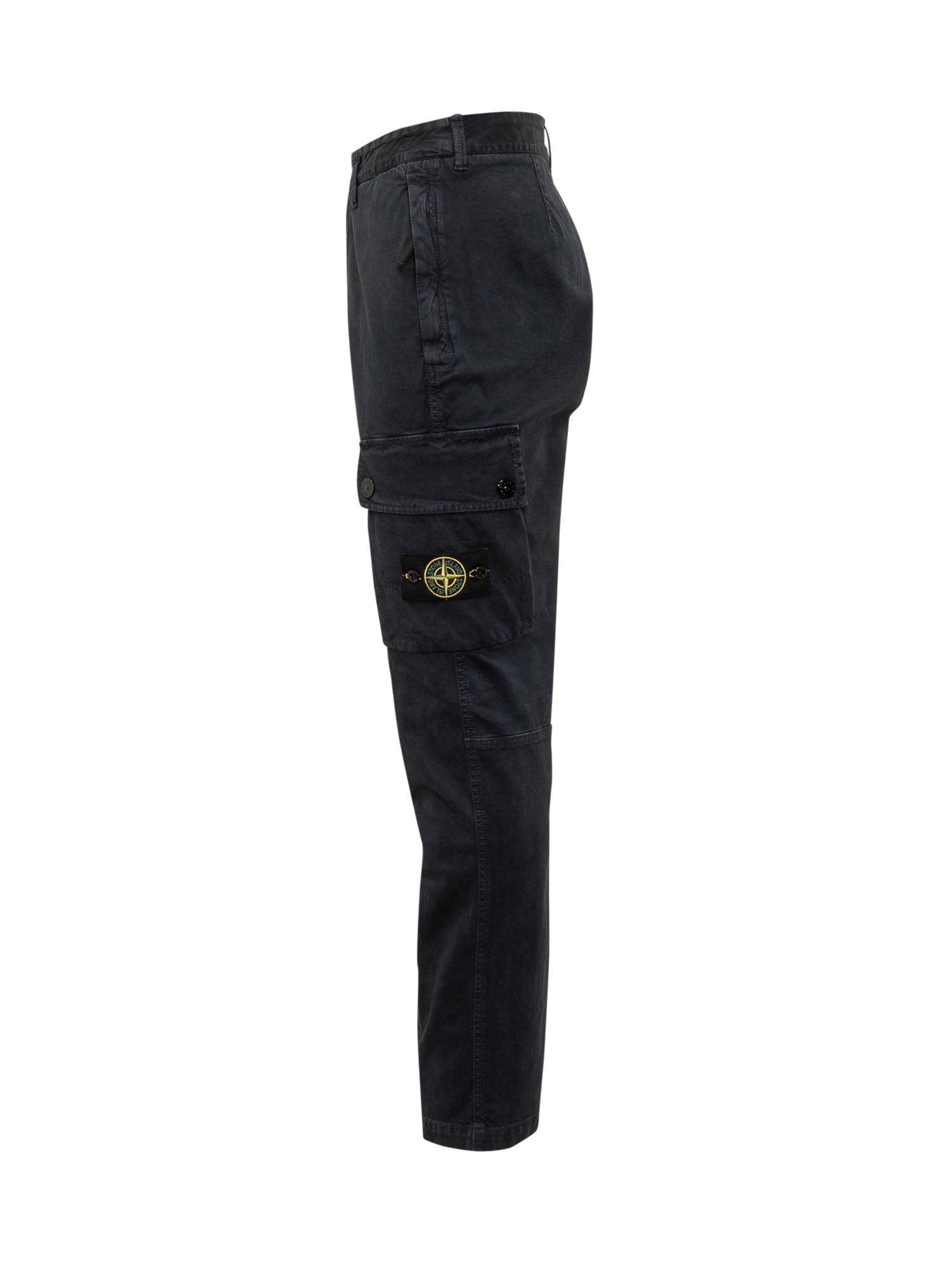Stone Island cargo pants in navy blue cotton with side pockets and iconic compass badge. Zip and button closure, belt loops.