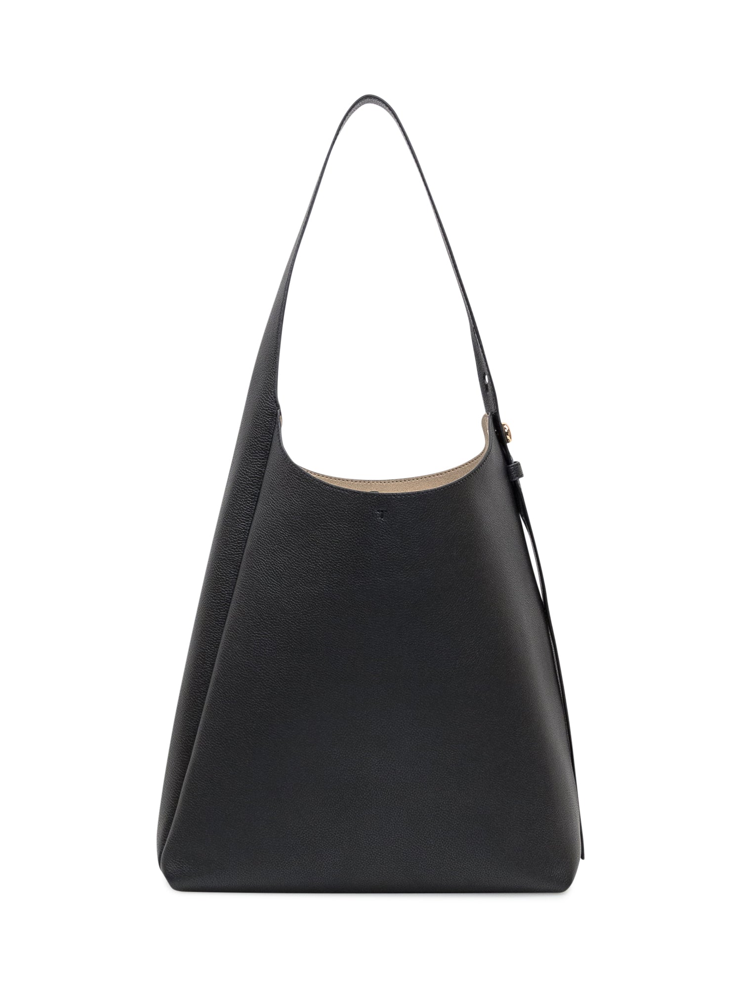 Hobo bag by Tory Burch crafted from black grained leather. Featuring a sleek and modern silhouette, it offers a wide handle for comfortable shoulder wear. The interior includes a pocket, and the top closes securely with a metal clasp.