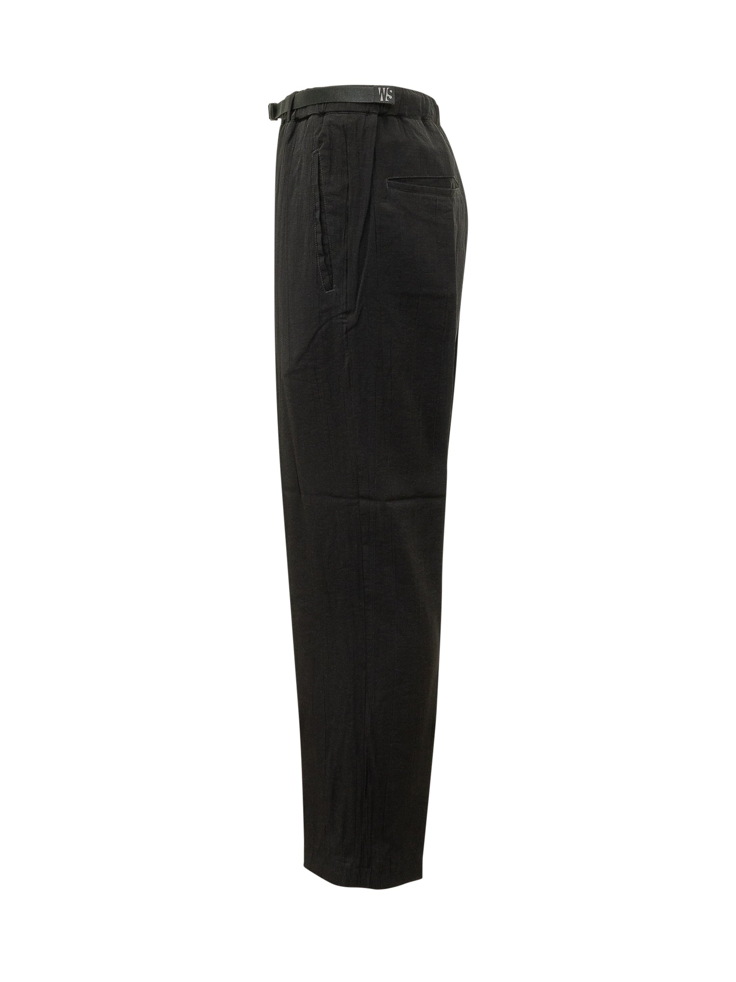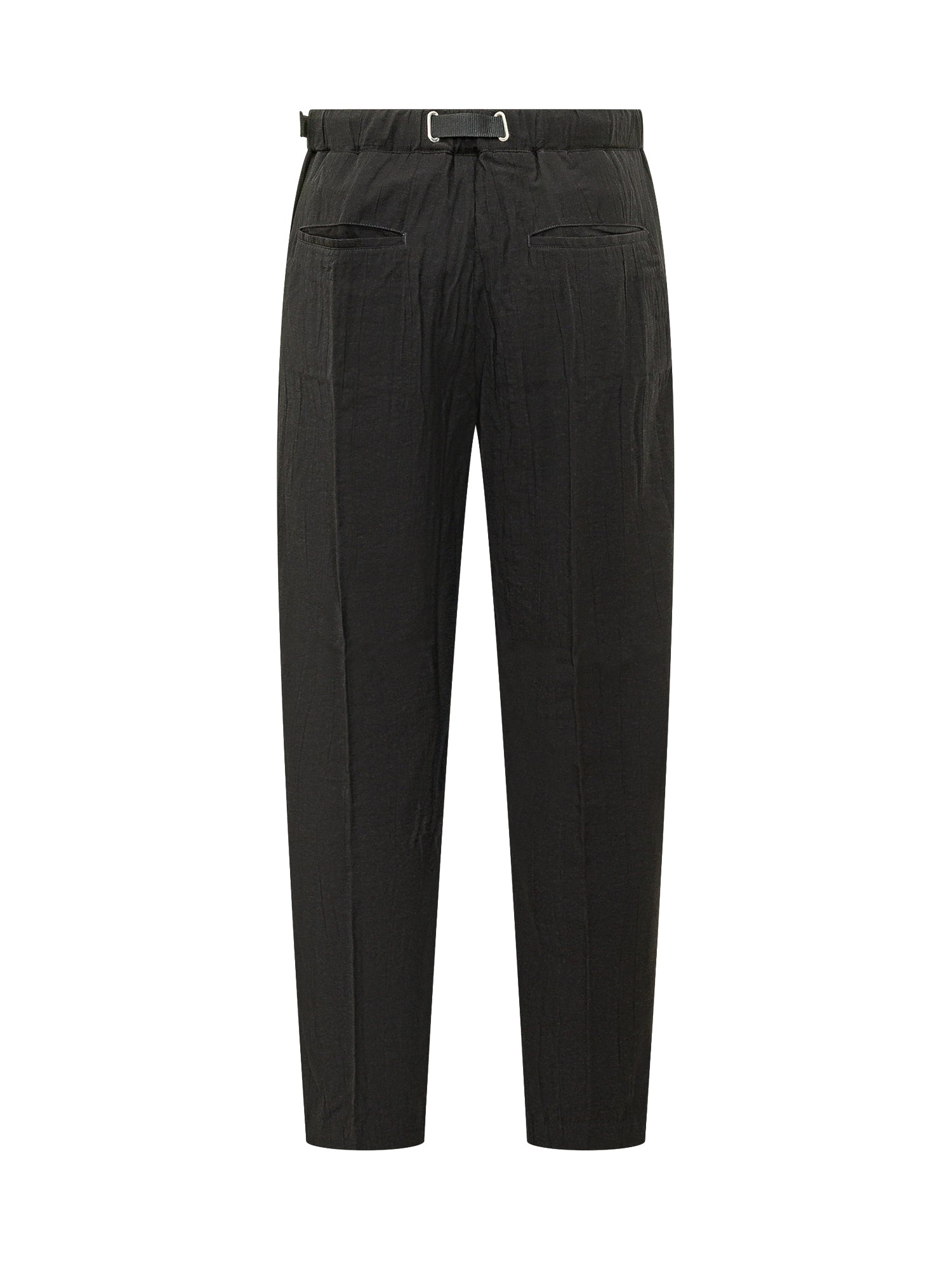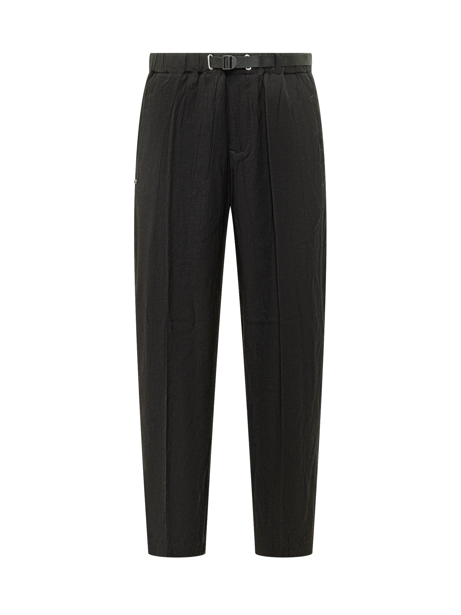 Long pants with elasticated waist and front pleats, integrated belt with buckle, belt loops.