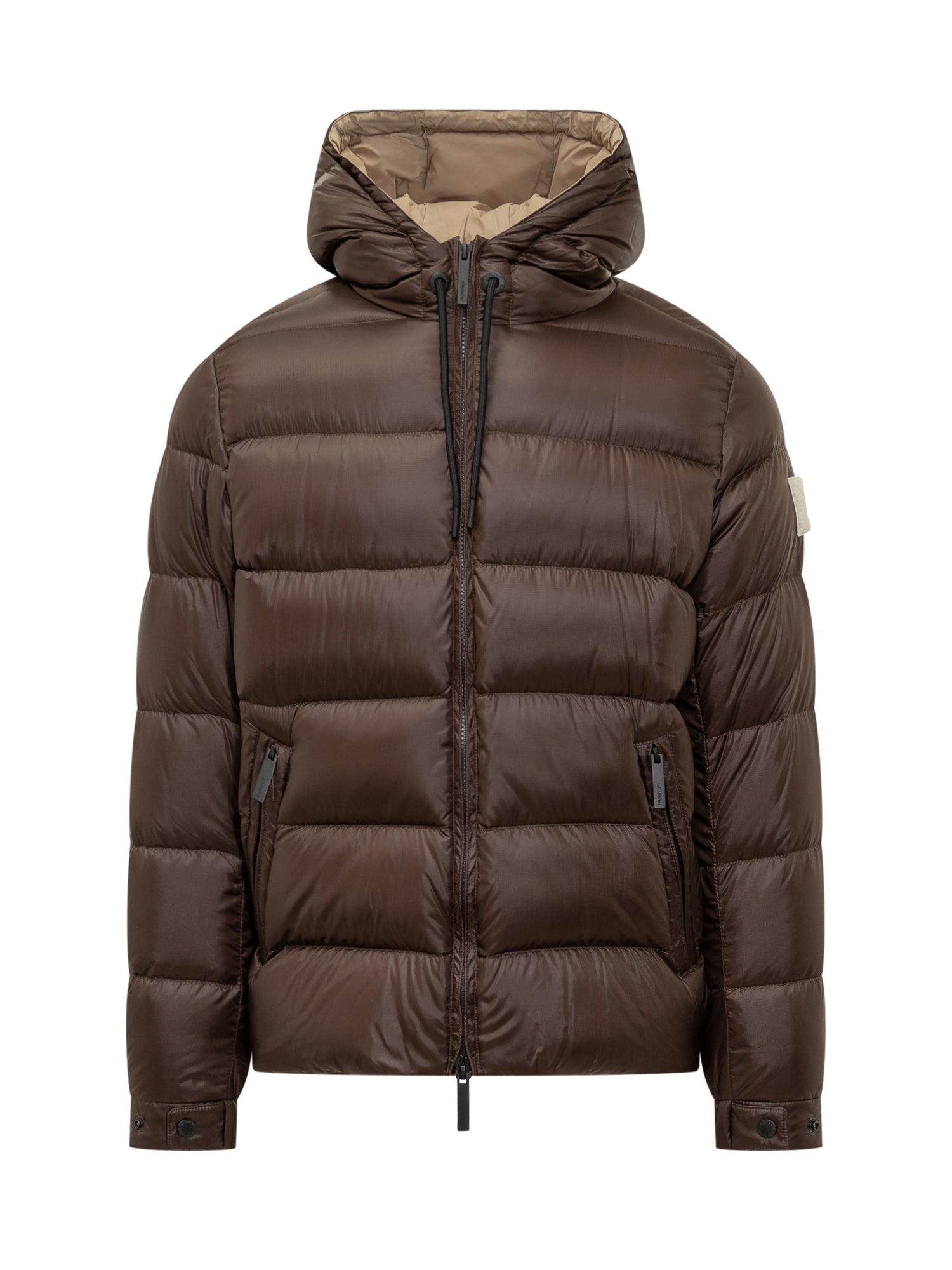 After Label brown shiny nylon down jacket with adjustable hood, zip closure and side pockets. Warm yet lightweight padding for a modern.