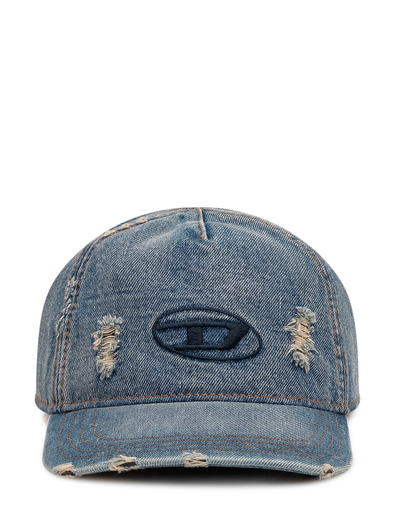 Denim cap with distressed details and front embroidered logo.