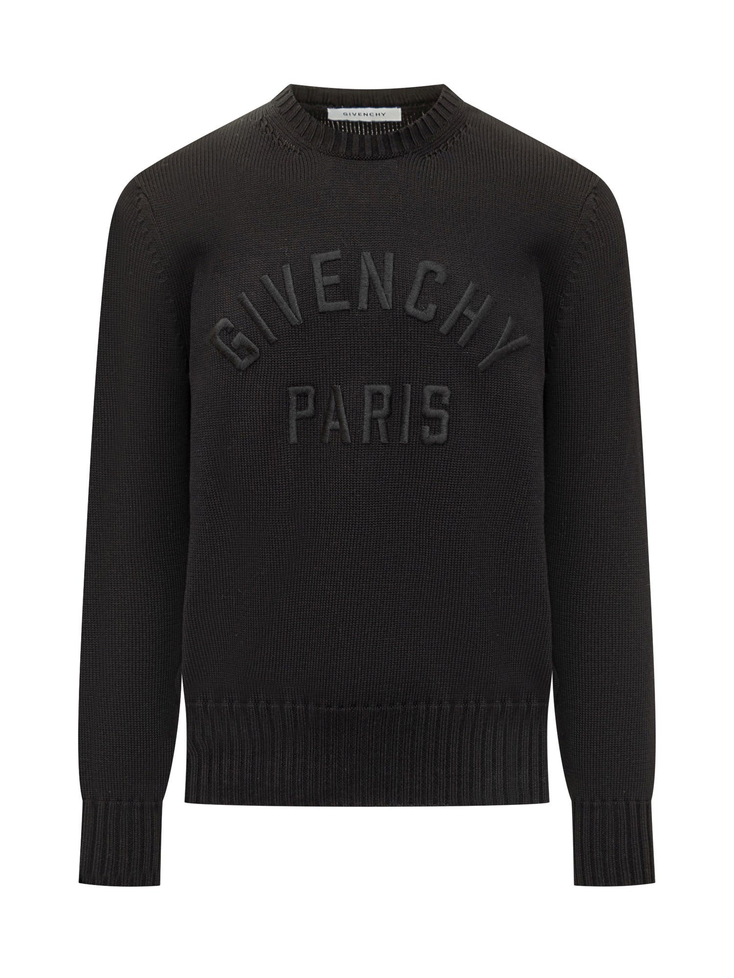 Black cotton sweater with tone-on-tone embroidered Givenchy Paris logo on the chest.
