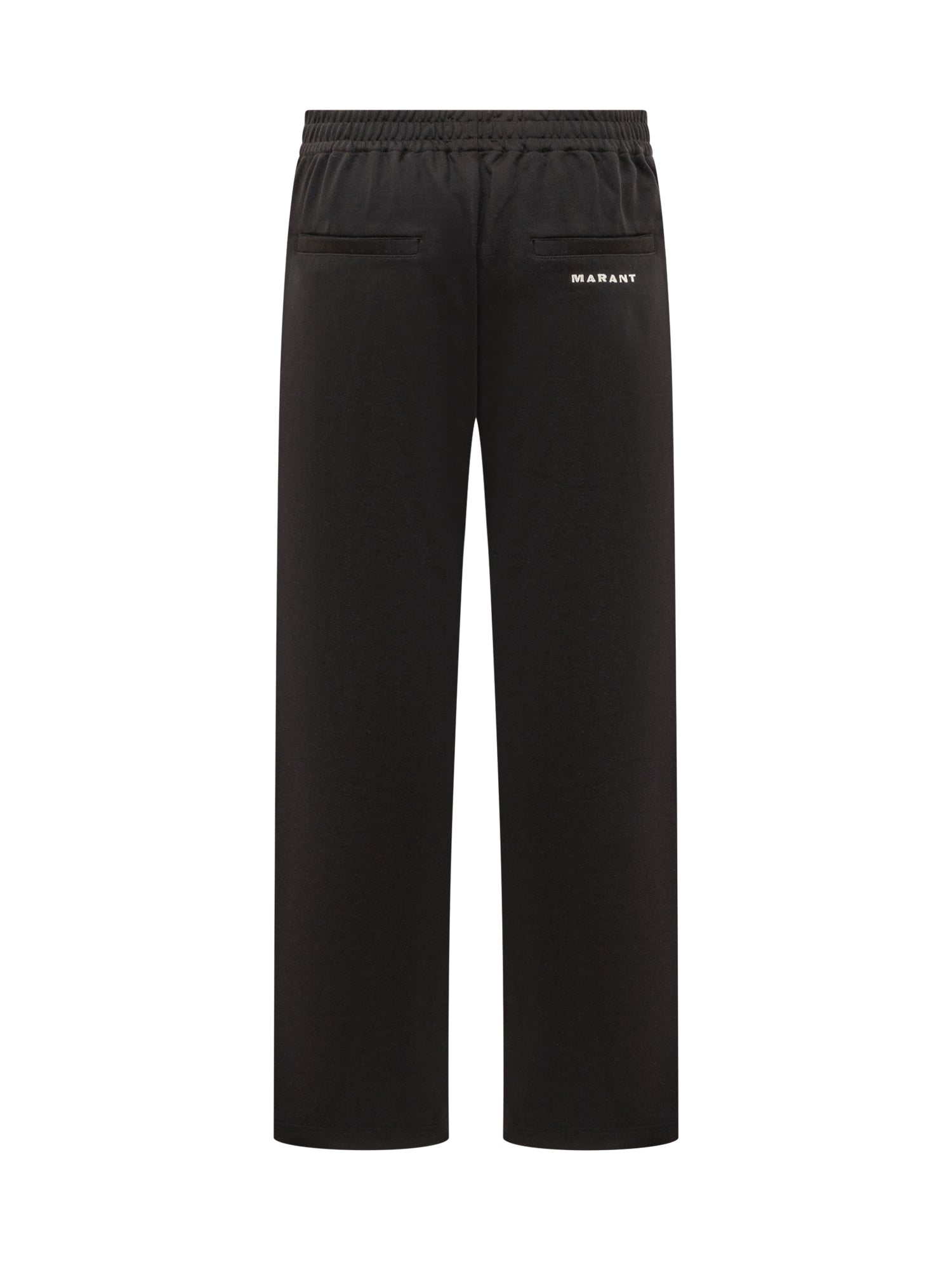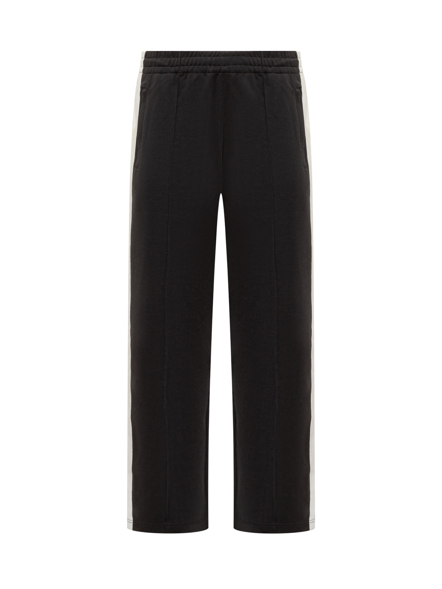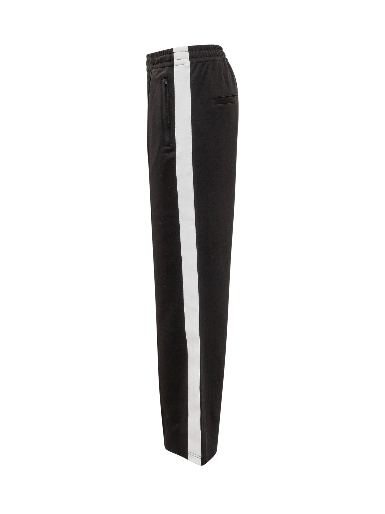 Straight fit pants. Elasticized waistband. Two slanted zippered pockets at front. Two welt pockets on back. Logo bands on the sides. Embroidered logo on back.