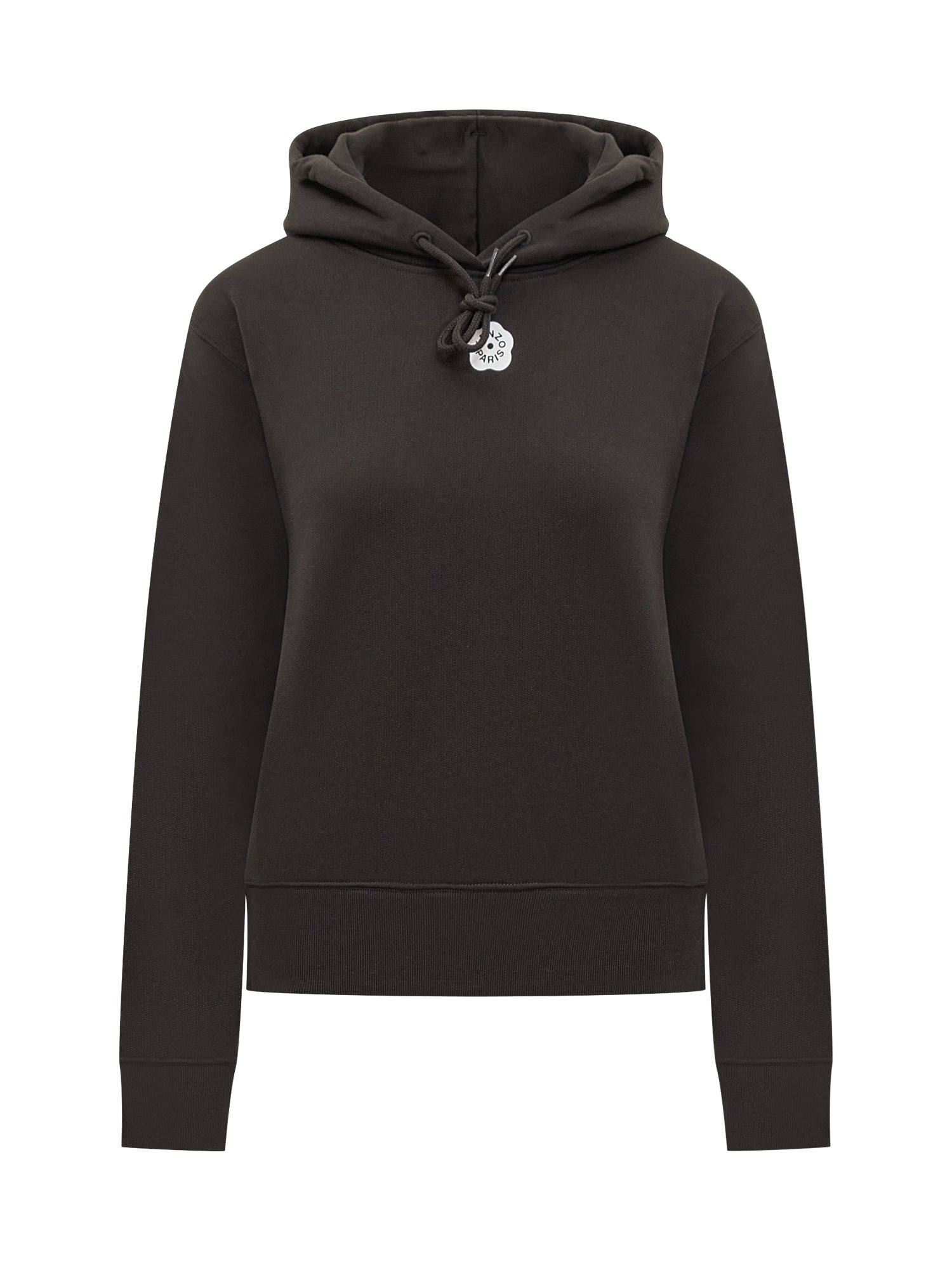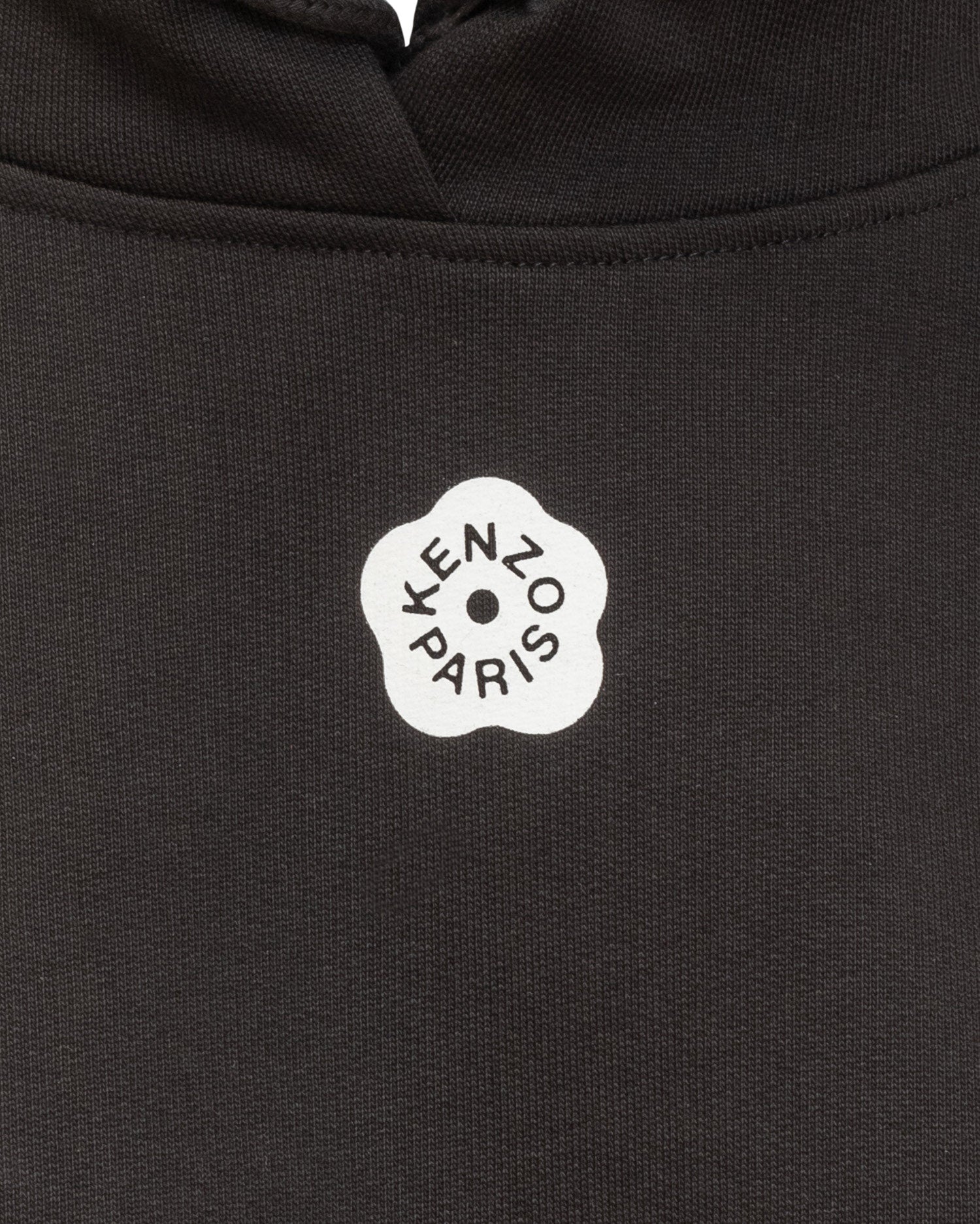 Black Kenzo cotton hoodie with adjustable drawstring and floral logo charm.