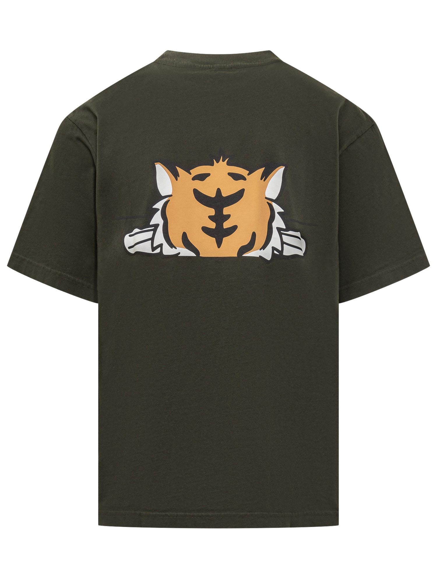 Kenzo green cotton T-shirt featuring the iconic multicolor tiger print on the front.